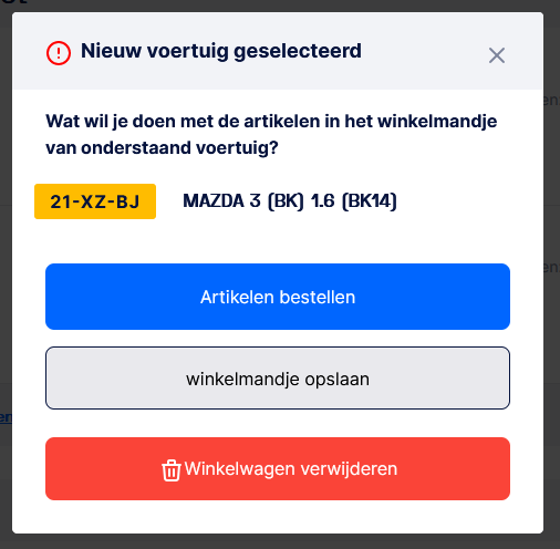 De artikelen van het vorige winkelmandje worden opgeslagen en de artikelen van je huidige voertuig worden in het nieuwe actieve mandje geplaatst.