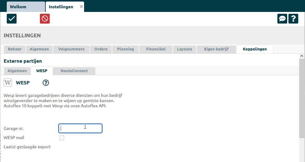 Alle functionaliteit van deze service is aanwezig op de Wesp site: https://www.mywesp.com/nl/. Hiervoor kan je je eigen login gebruiken. De benodigde gegevens worden automatisch uit Autoflex gehaald.
