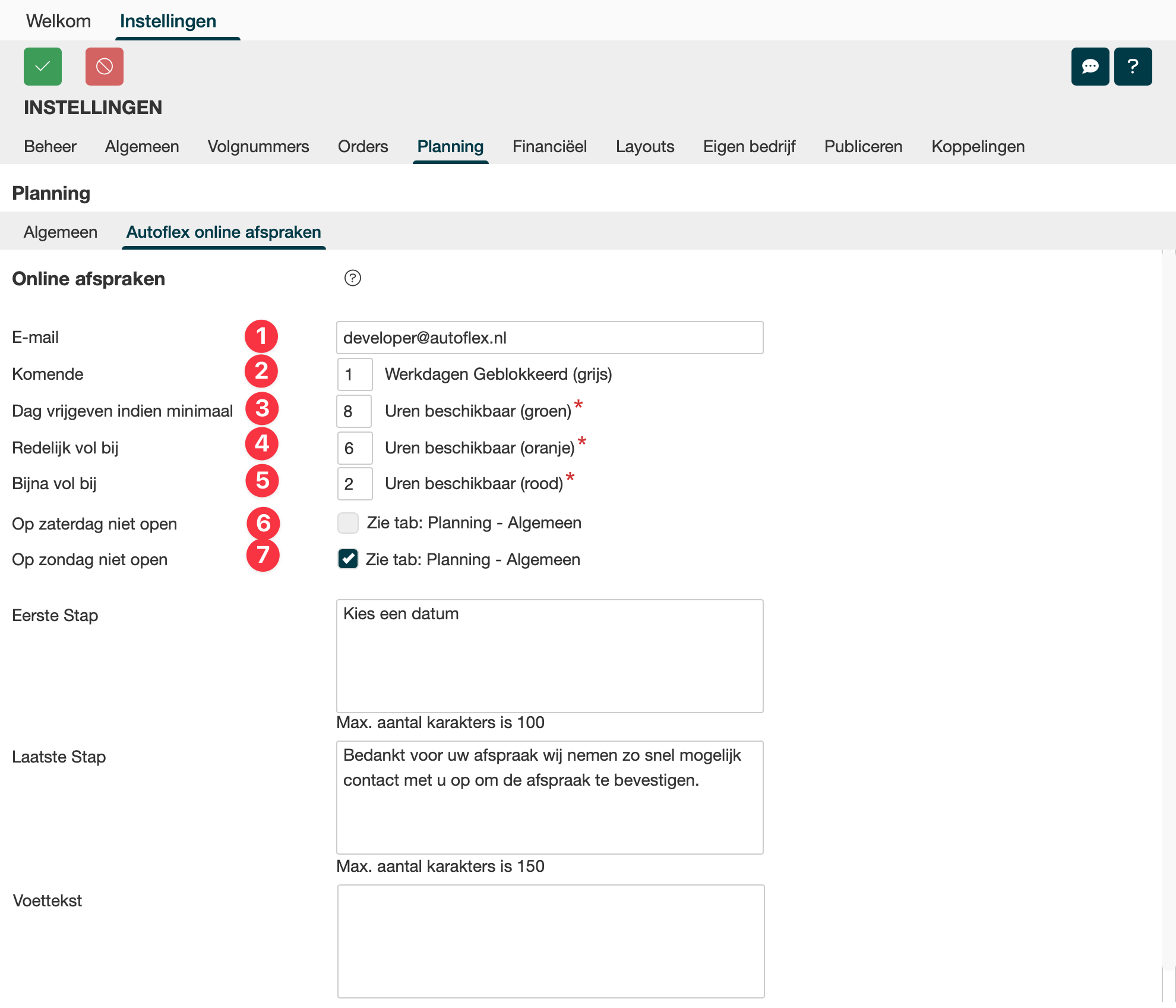Optioneel kunnen de uren beschikbaar worden ingesteld en zaterdag niet beschikbaar. Deze instellingen zorgen ervoor dat een klant geen afspraak kan maken op basis van de beschikbare datum en tijd, afhankelijk van de actuele planning / beschikbare uren. Zodra je hier een wijziging maakt moet je op instellen klikken.