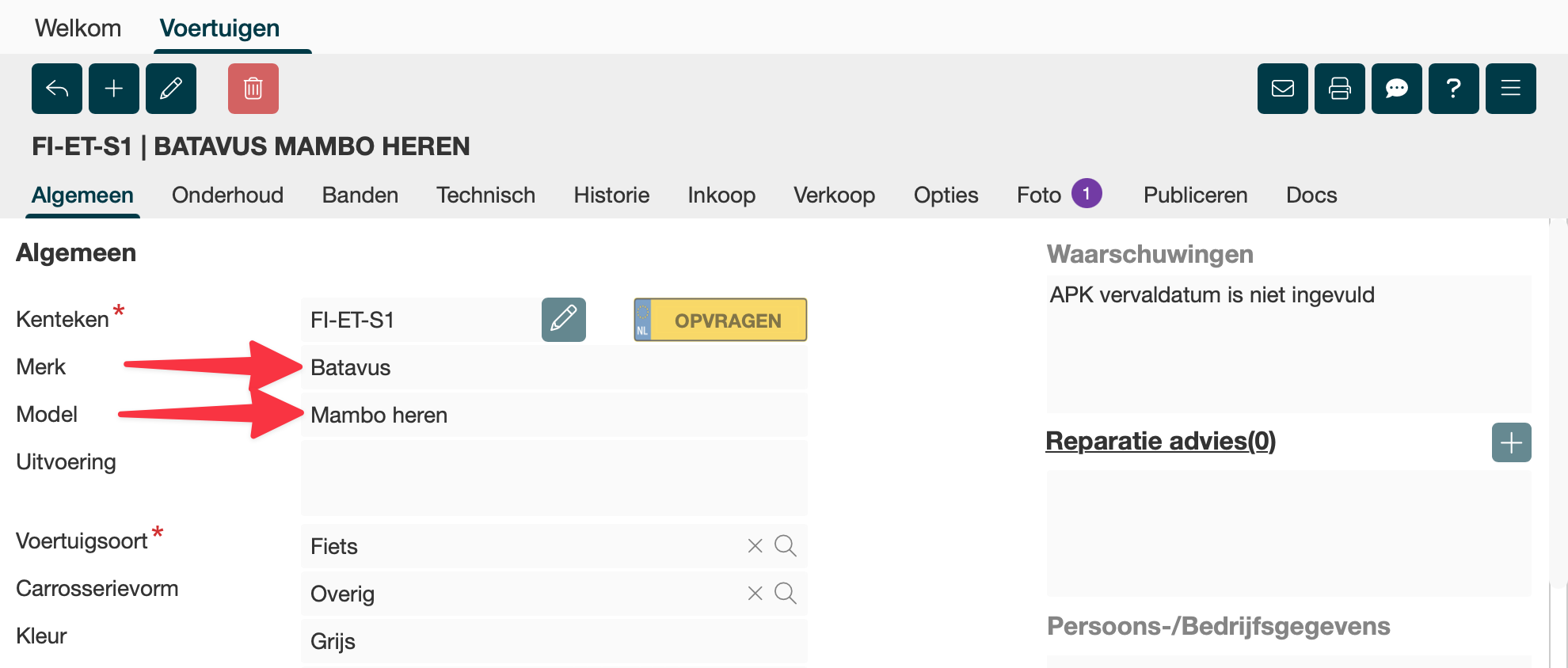 Als het om een leenfiets gaat kan je bijvoorbeeld bij Merk Fiets invullen en bij Model 01 invullen