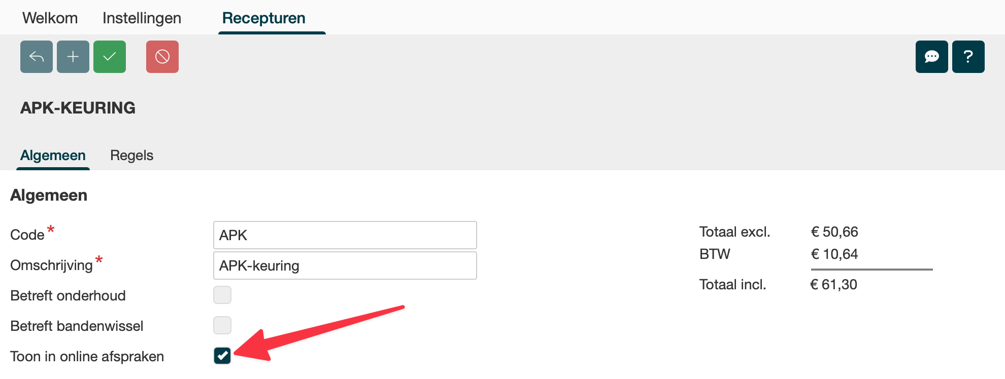 Zet bij in ieder geval één receptuur het vinkje Toon in online afspraken aan.