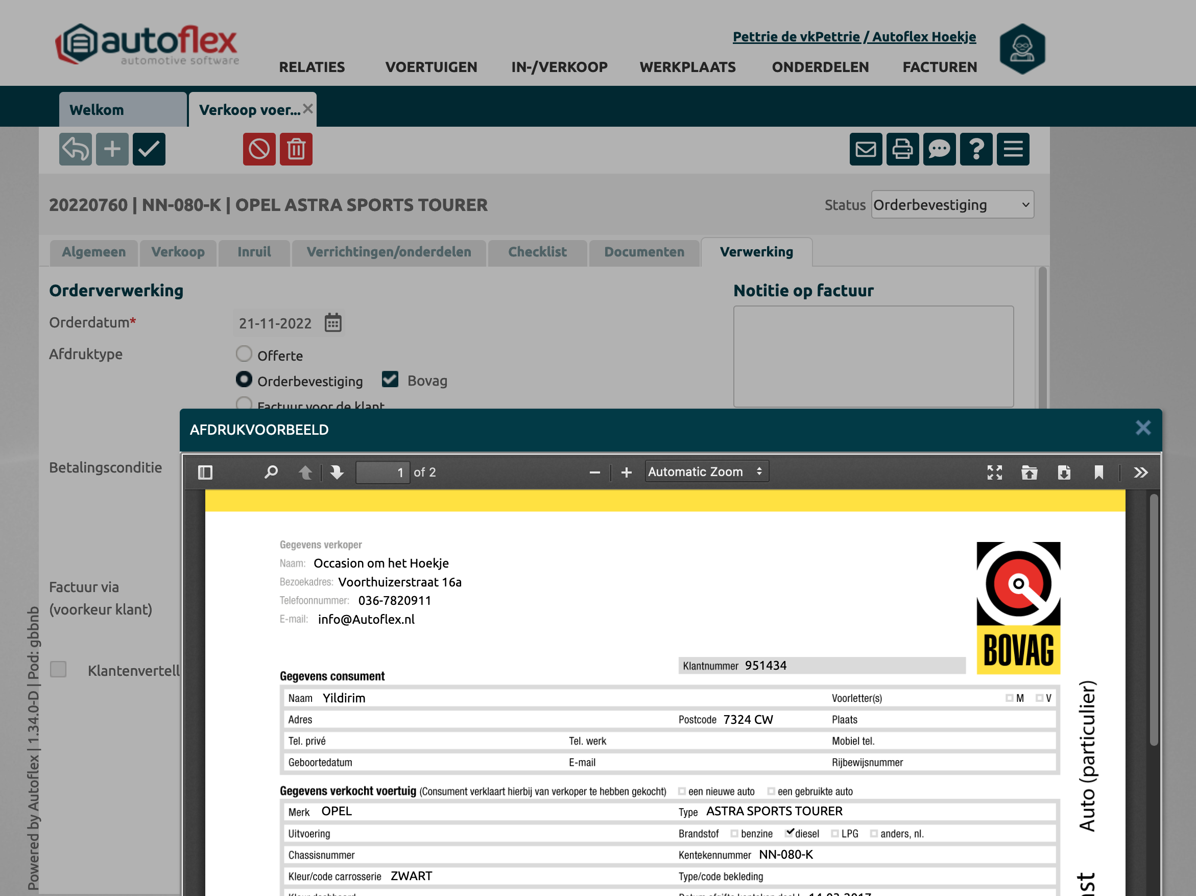 Bij het verwerken van de order, in de tab: Verwerking bij de keuze: Orderbevestiging is er nu een keuze: Bovag bij gekomen. Zodra deze optie is aangevinkt zal het Bovag: Koopovereenkomst-auto-particulier PDF document worden aangemaakt. Deze kan worden geprint via de print knop of direct naar de klant via e-mail worden verstuurd. De bovag koopovereenkomst is alleen zichtbaar bij verkoop naar particuliere kopers. |