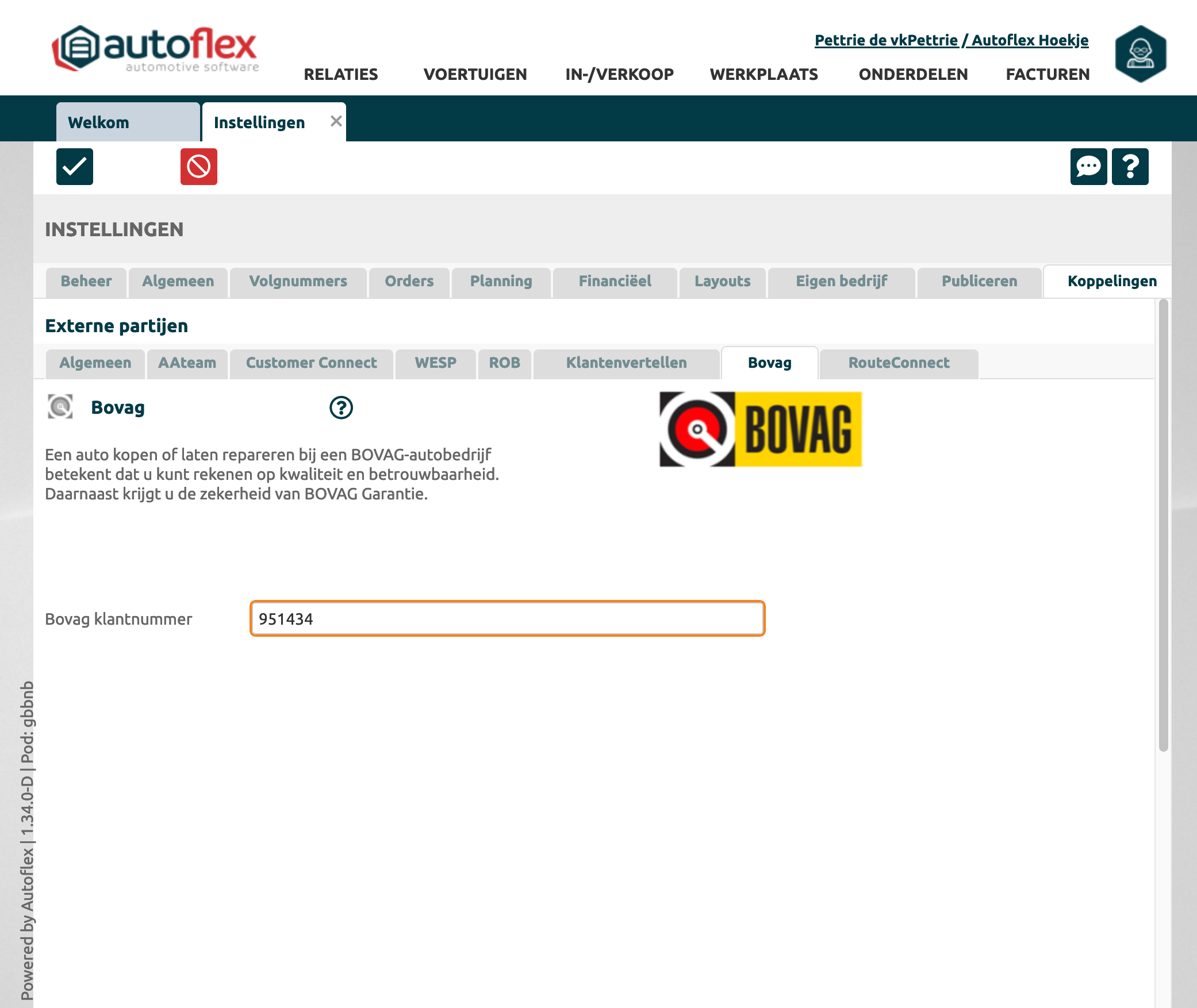 Instellingen → Externe partijen → Bovag |