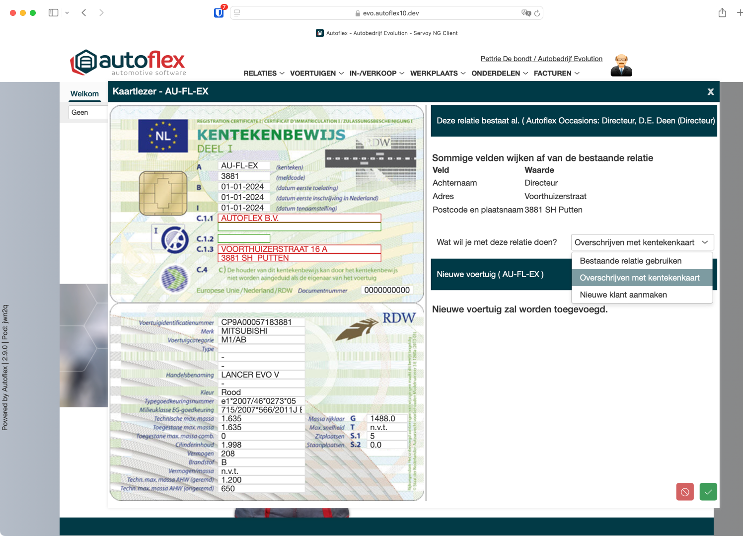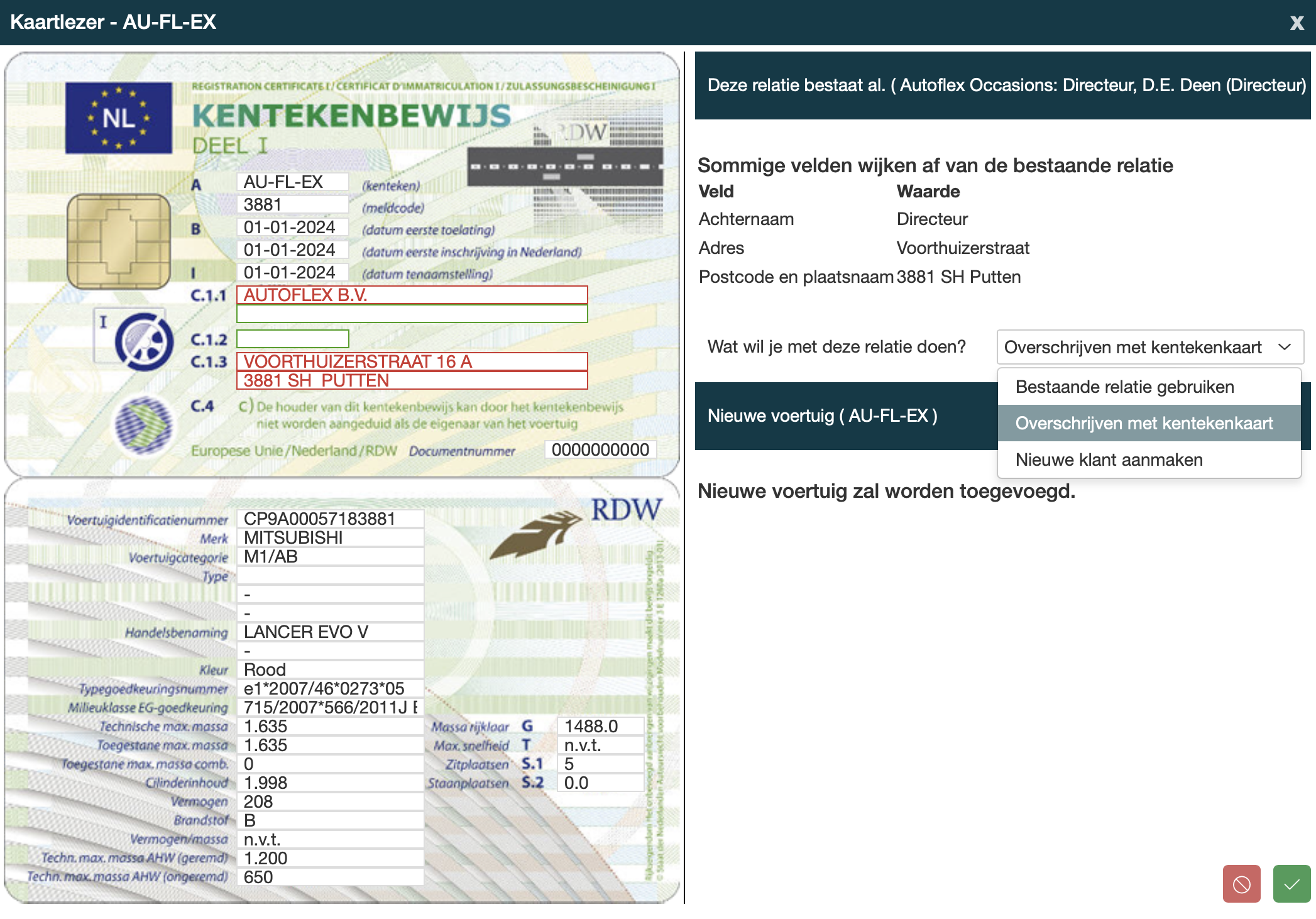 De relatie kan worden geupdate met de gegevens van het kentekenbewijs, zie de in rood aangegeven velden. |