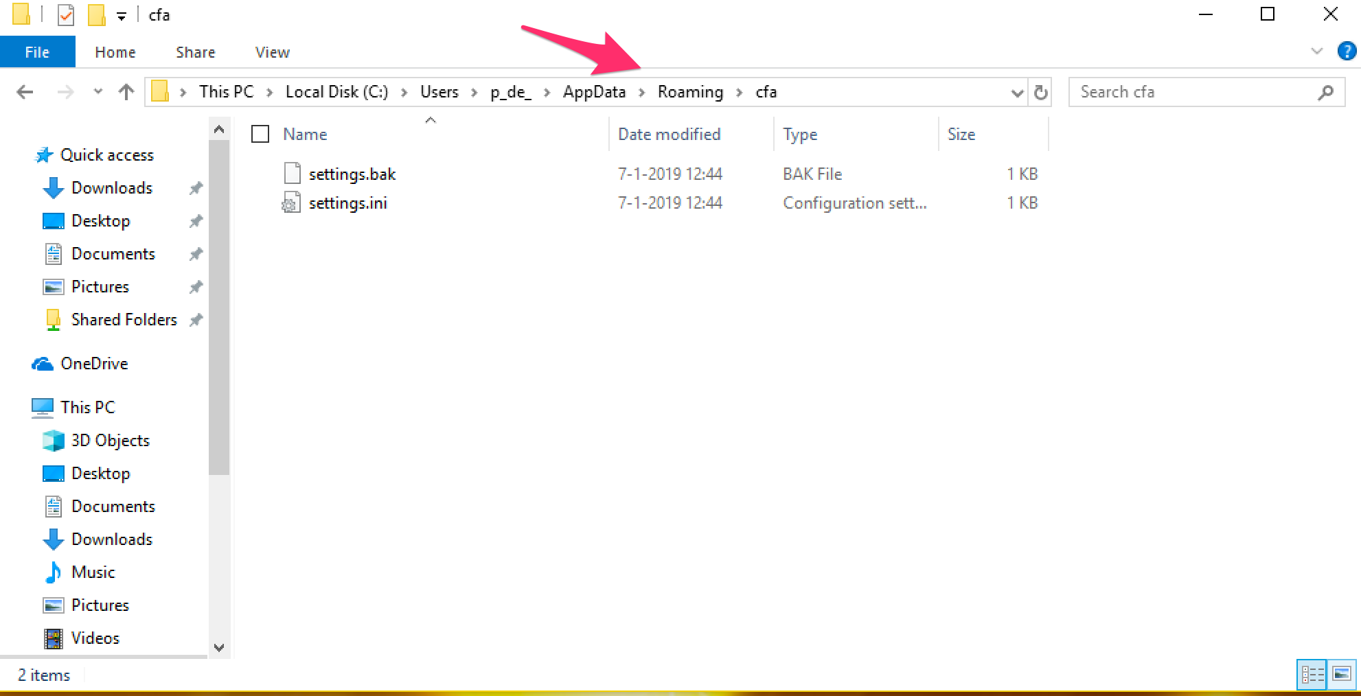 3. Verwijder de instelling INI map C:\Users\<gebruikersnaam>\Roaming\cfa |