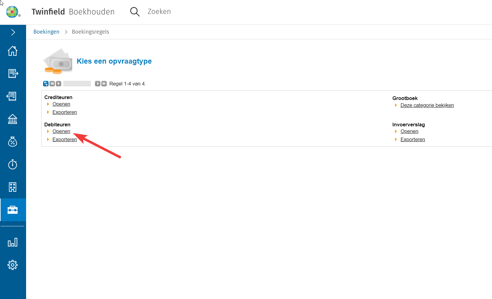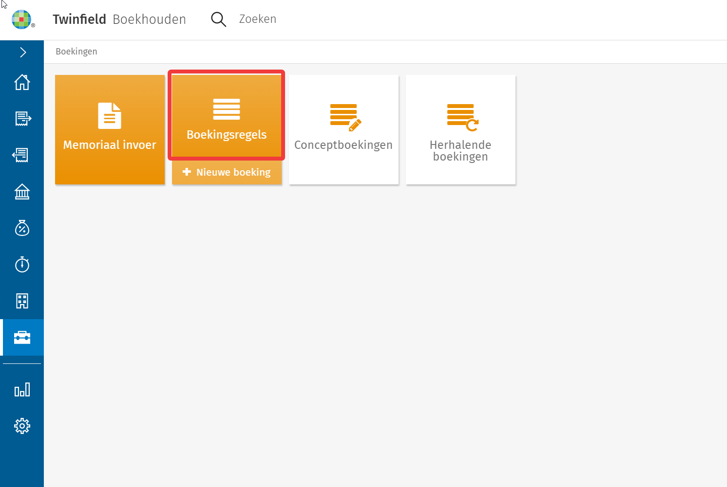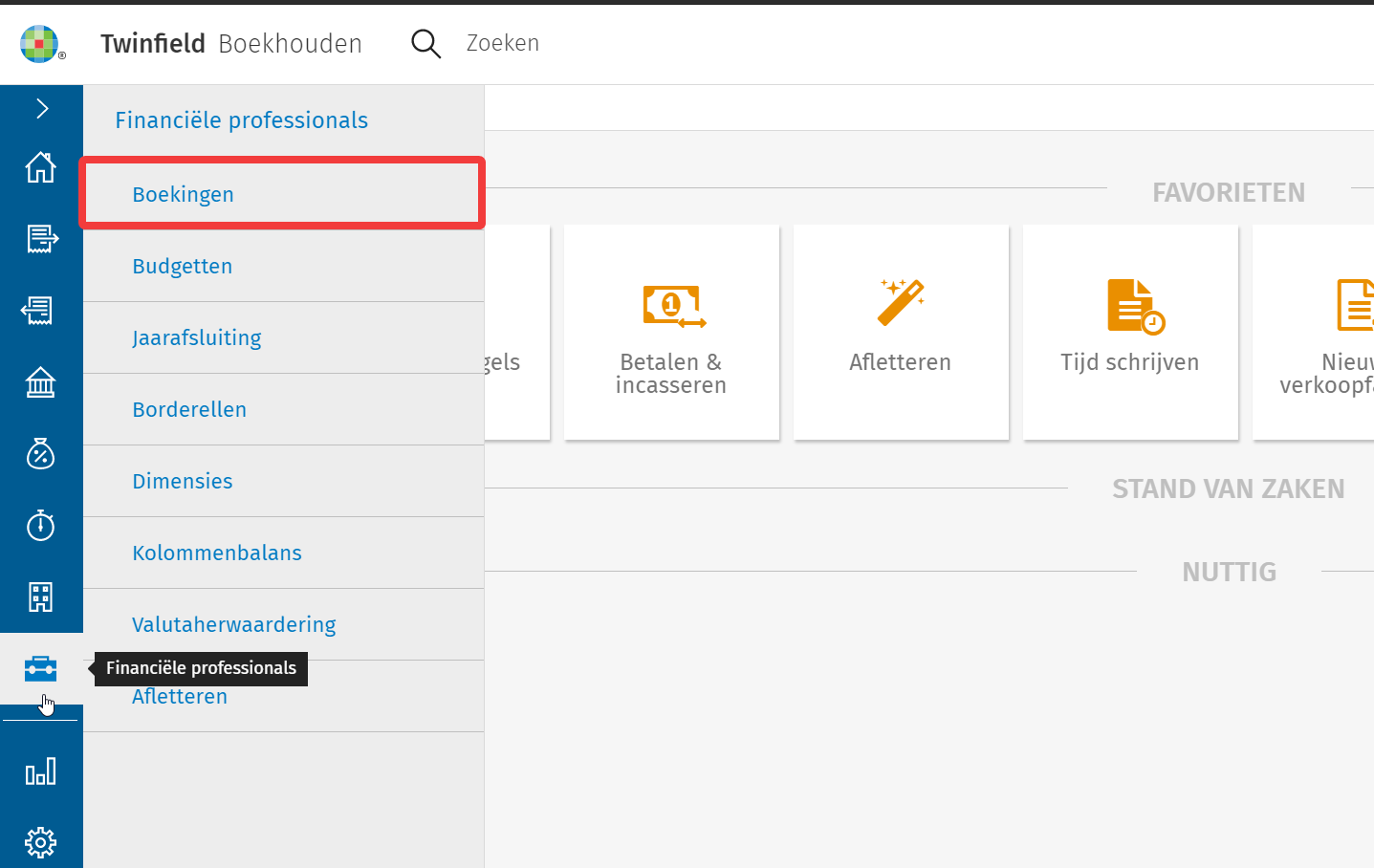 Zodra de factuur vanuit Autoflex is geëxporteerd naar Twinfield kan je deze boeking bekijken in de administratie. Klik hiervoor linksonder op het koffertje en klik vervolgens op Boekingen.