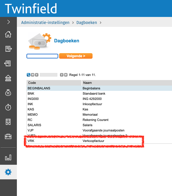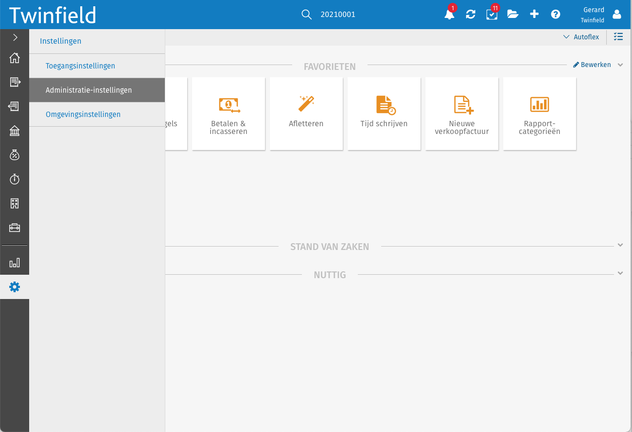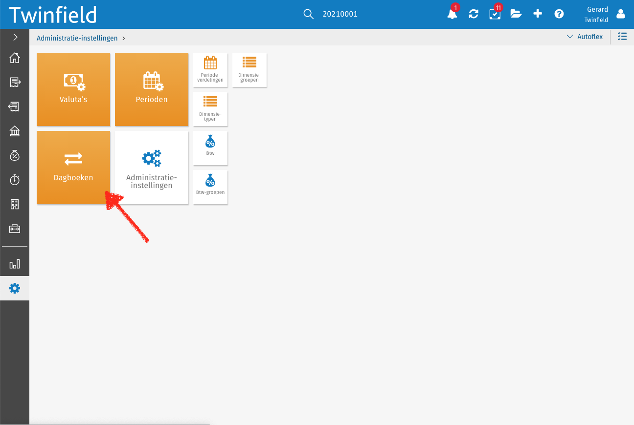 Zodra de factuur vanuit Autoflex is geëxporteerd naar Twinfield kan je deze boeking bekijken in de administratie. Klik hiervoor linksonder op het koffertje en klik vervolgens op Boekingen.