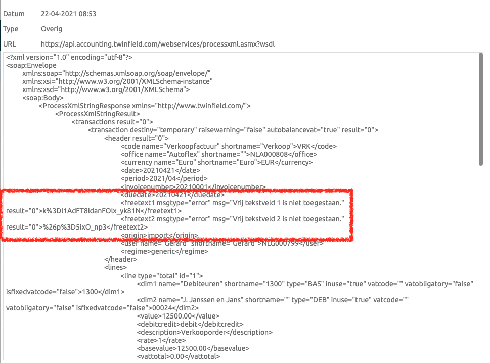 Indien dit niet is ingesteld, dan zal een melding als onderstaande in de log worden getoond en de boeking niet zijn doorgevoerd vanuit Autoflex10 naar Twinfield