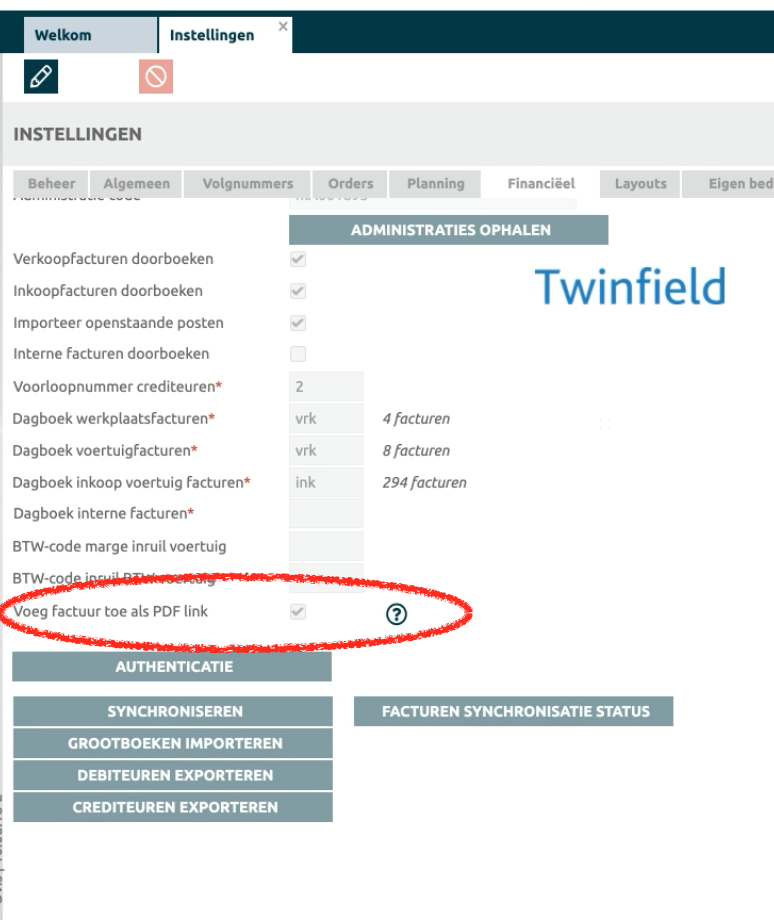 Om de PDF link functionaliteit te activeren en te synchroniseren met de Twinfield omgeving dient de volgende instelling in Autoflex 10 gezet te worden.