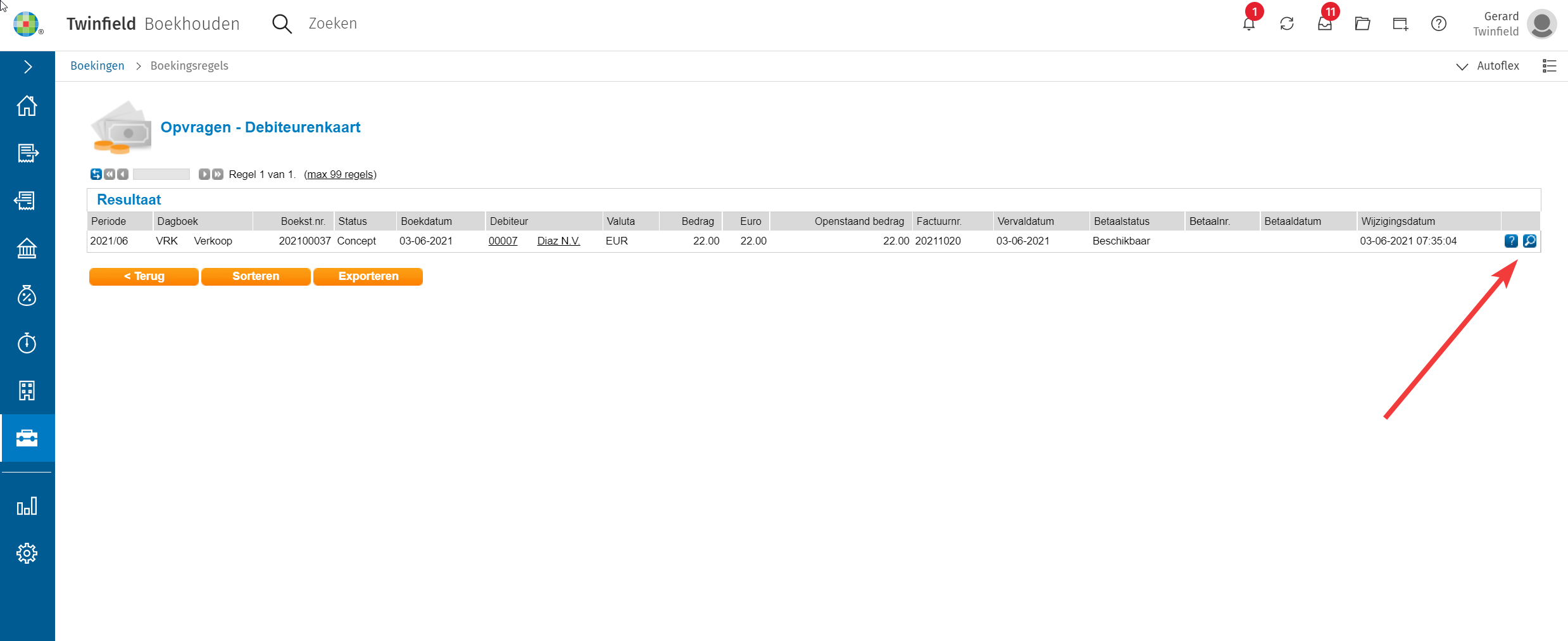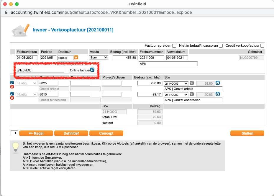 Een verkoop factuur die geboekt is in Twinfield geeft met de juiste instellingen een resultaat als in onderstaande afbeelding:
