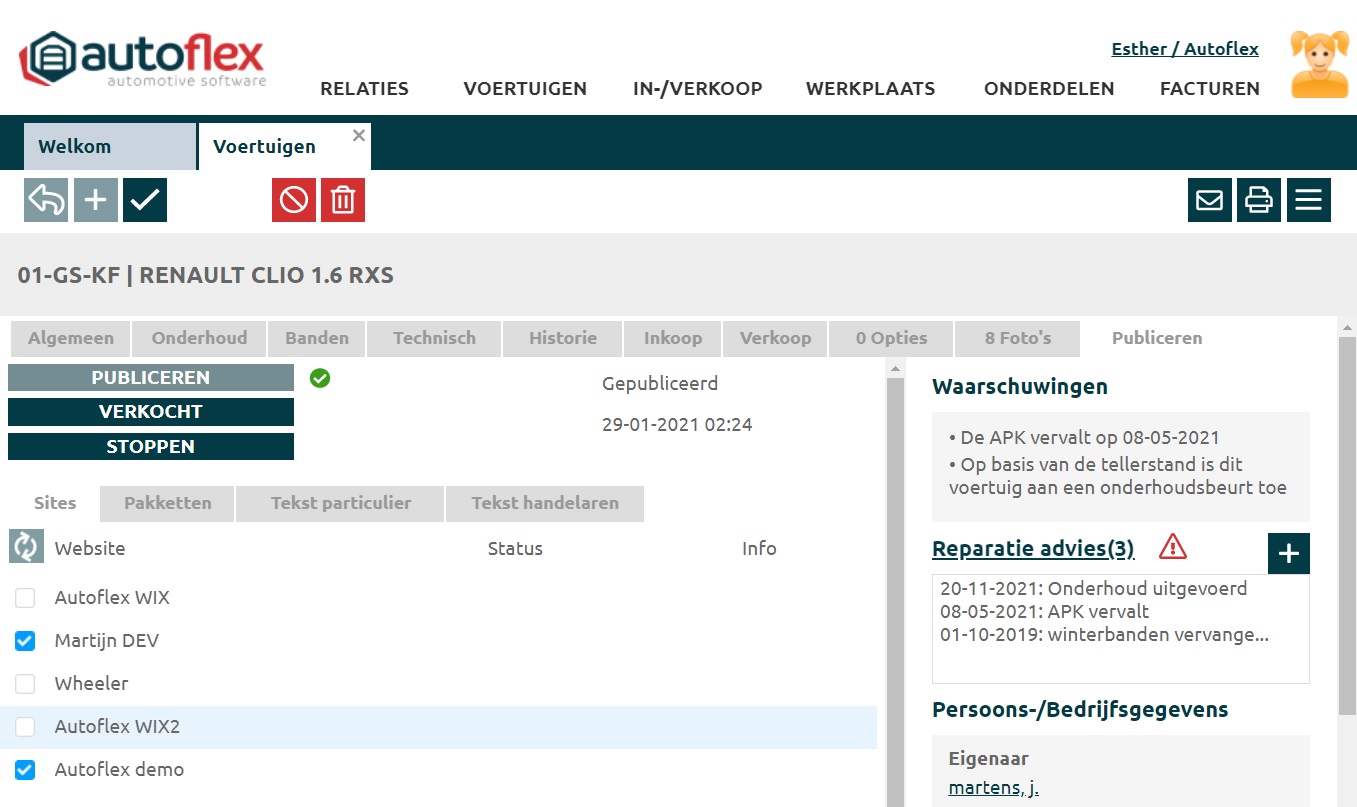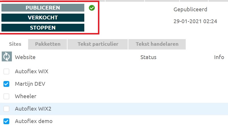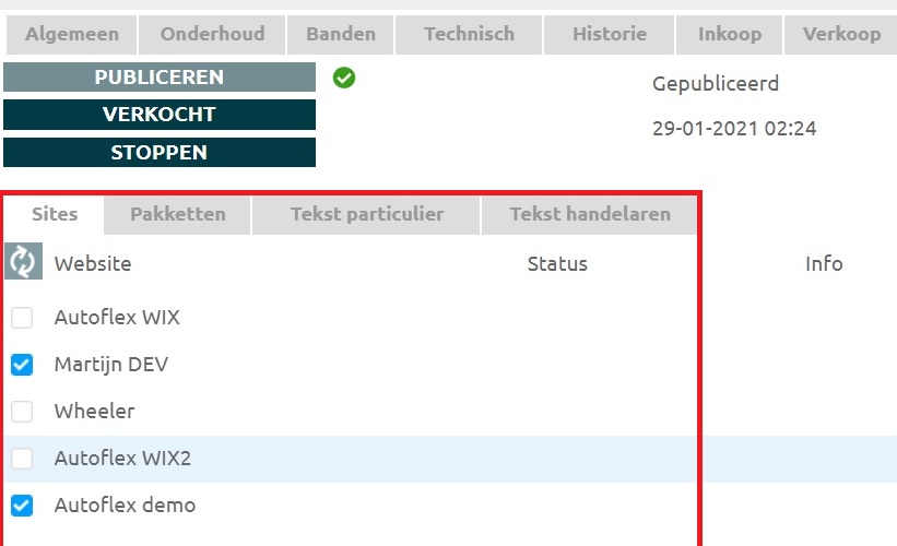 Je kan kiezen om het voertuig te publiceren en de websites selecteren waar je het voertuig zichtbaar wil maken.