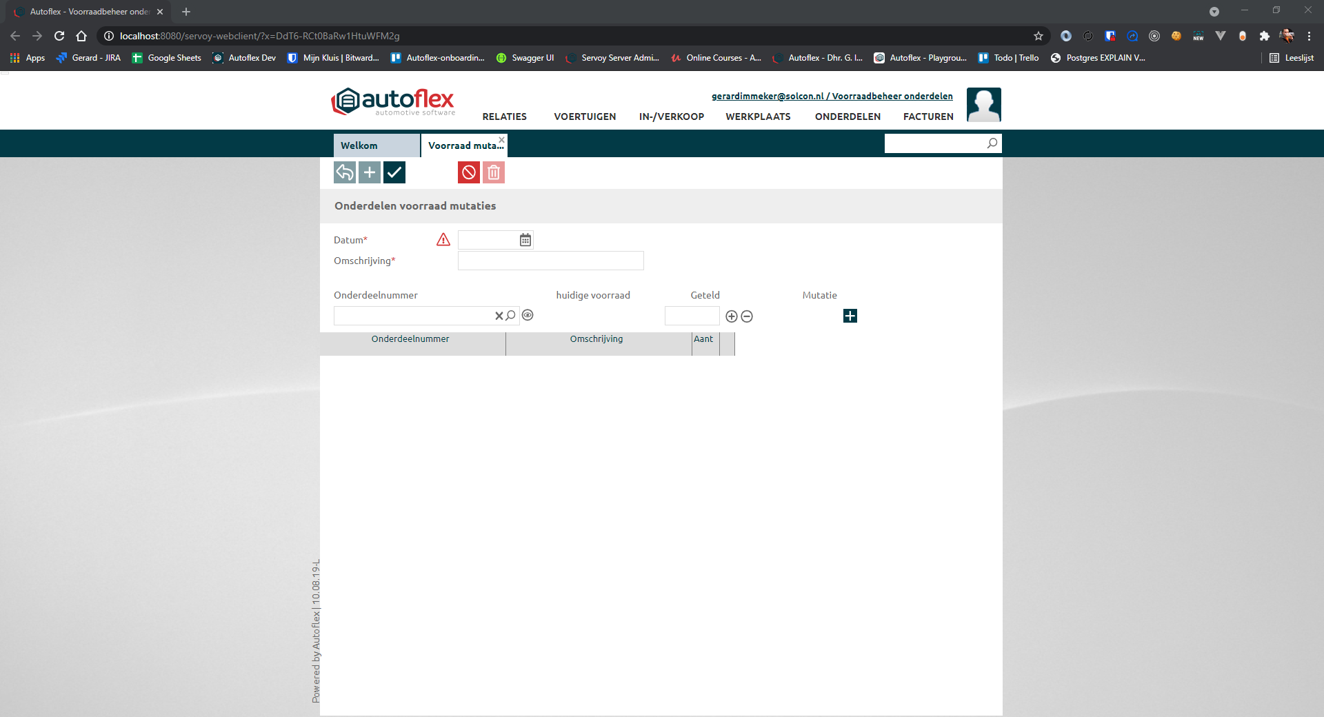 Het starten van de voorraad doe je door de voorraadmutaties in te voeren. Je vindt dit scherm via onderdelen → voorraad mutaties. Hier wordt de start van de voorraad van de onderdelen aangemaakt en voer je de periodieke tellingen van de voorraad door. |