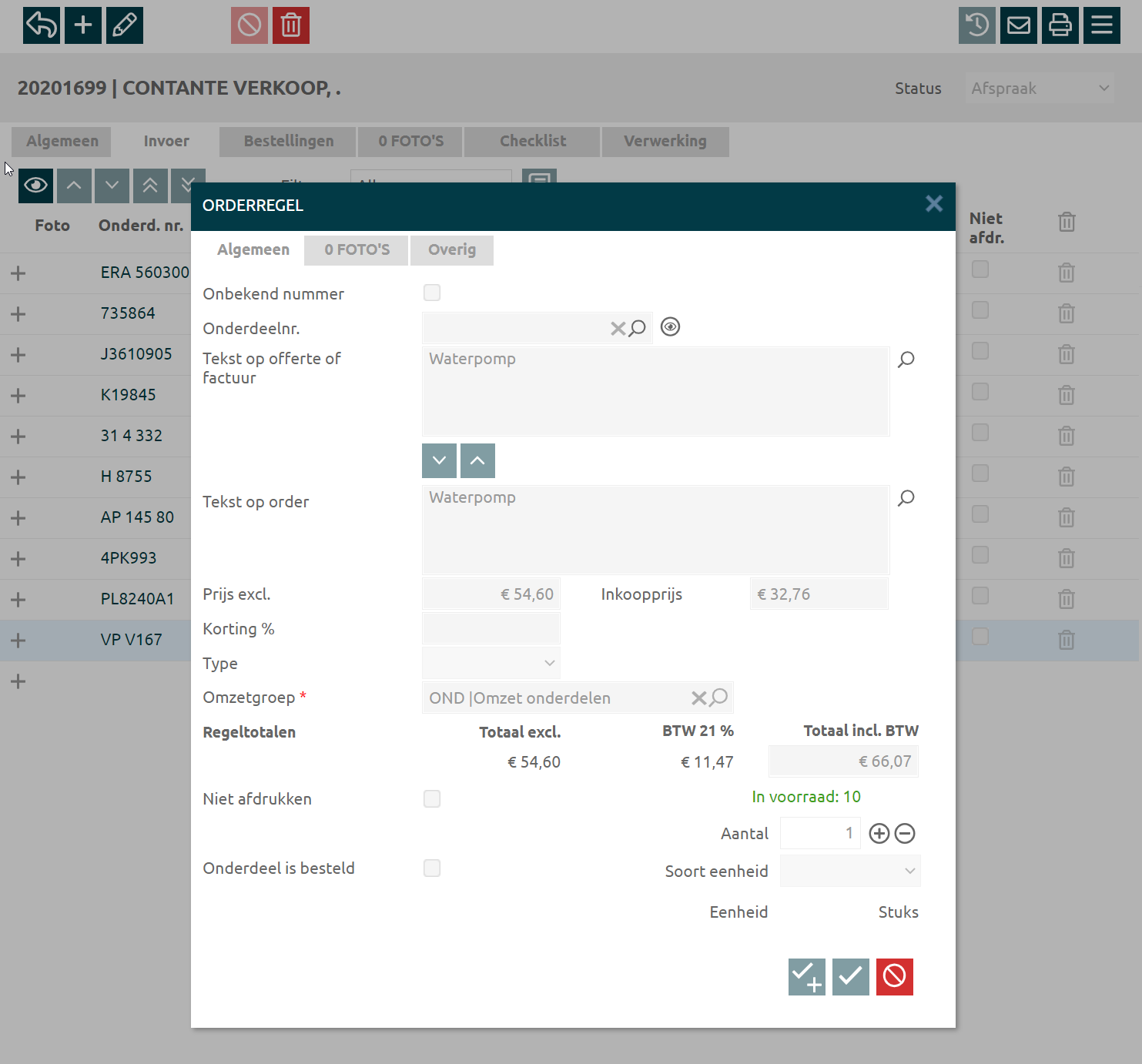 Een onderdeel verkopen doe je via een werkplaats- of autoverkoop-order. Tijdens het kiezen van het onderdeel zie je de actuele status. De voorraad wordt verlaagd met het aantal dat je invoert als de status van de order "Order" of "Gereed" is. |