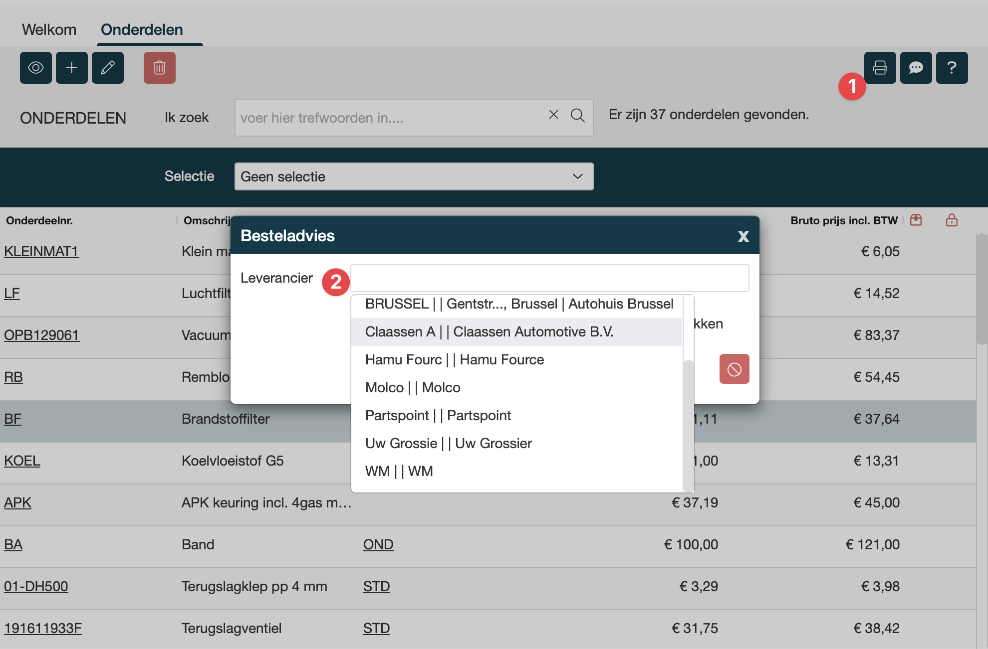 Klik het Onderdelen-overzicht op de Printknop en selecteer vervolgens Besteladvies.
