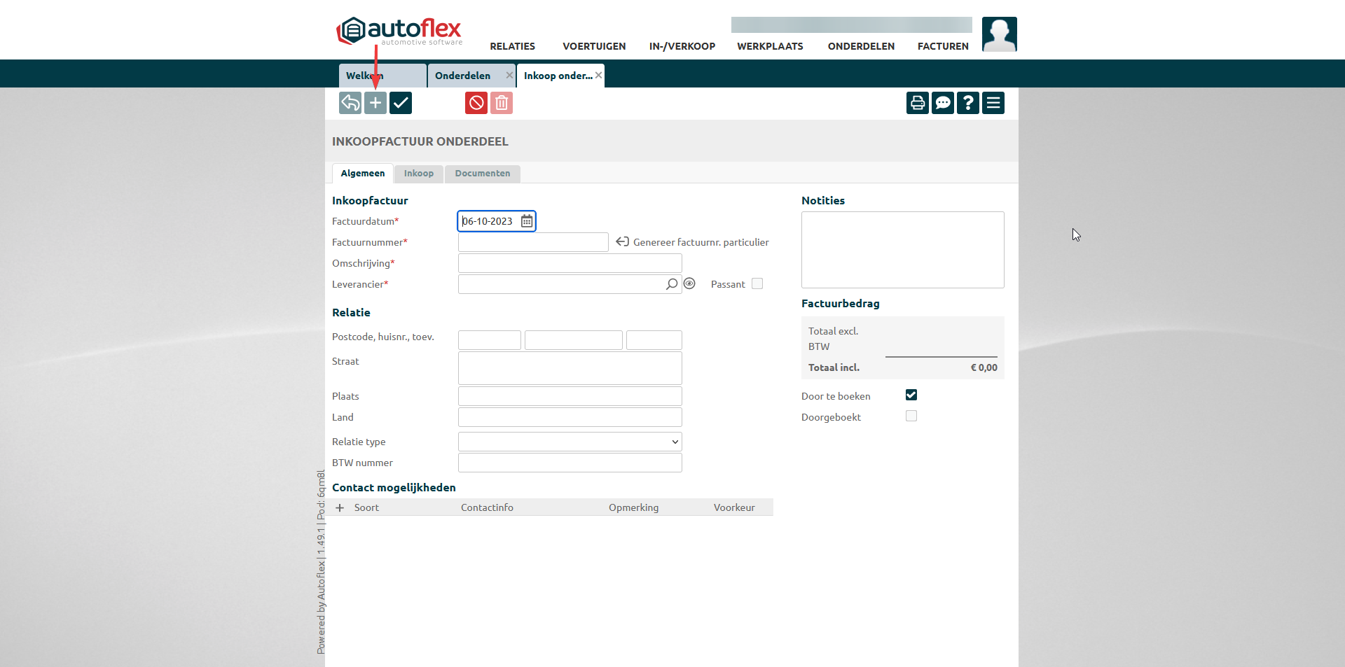 Factuurnummer: dit is een verplicht veld. Als je een onderdeel inkoopt van een particulier kun je een factuurnummer laten genereren. Dit nummer wordt ook gebruikt bij het doorboeken naar het gekoppelde boekhoudpakket