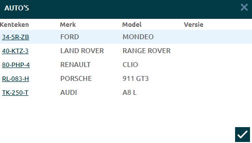 Als je hier op klikt krijg je de kentekens van de gekoppelde voertuigen te zien.