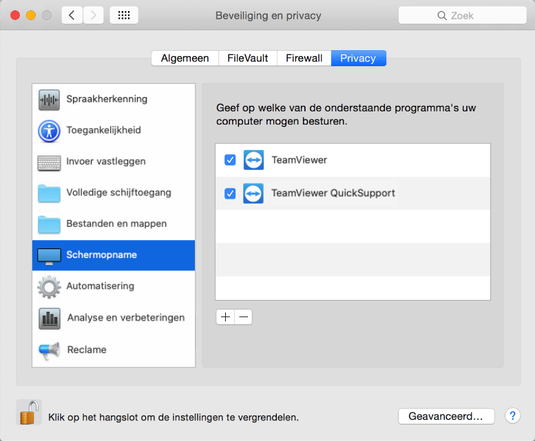 Ga via het Apple-menu naar Systeemvoorkeuren. Klik hier op "Security & Privacy" of "Beveiliging en privacy". Klik onder "Privacy" op het item "Accessibility" of "Toegankelijkheid". Mogelijk moet u eerst nog op het hangslotje klikken en uw gebruikersnaam en wachtwoord ingeven om het venster te kunnen ontgrendelen. Geef vervolgens toegang aan TeamViewer door deze aan te vinken. |