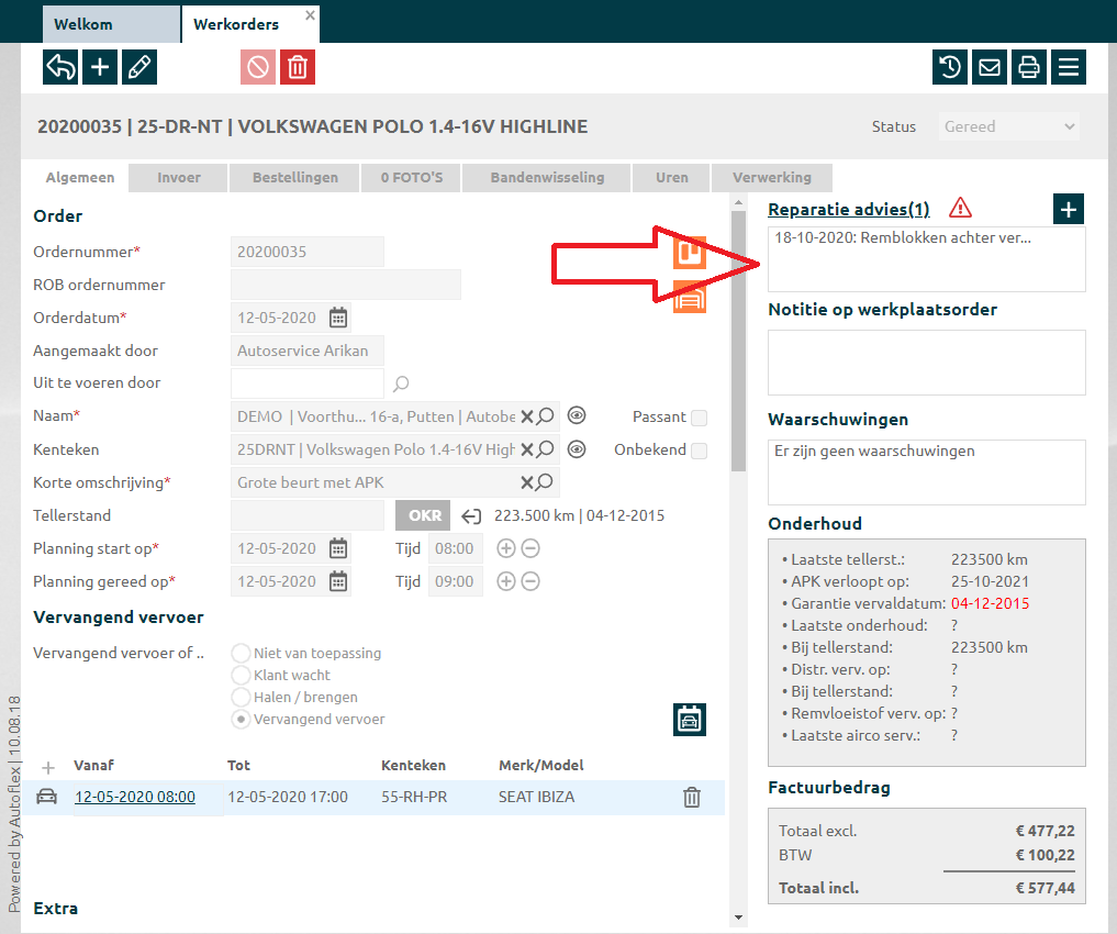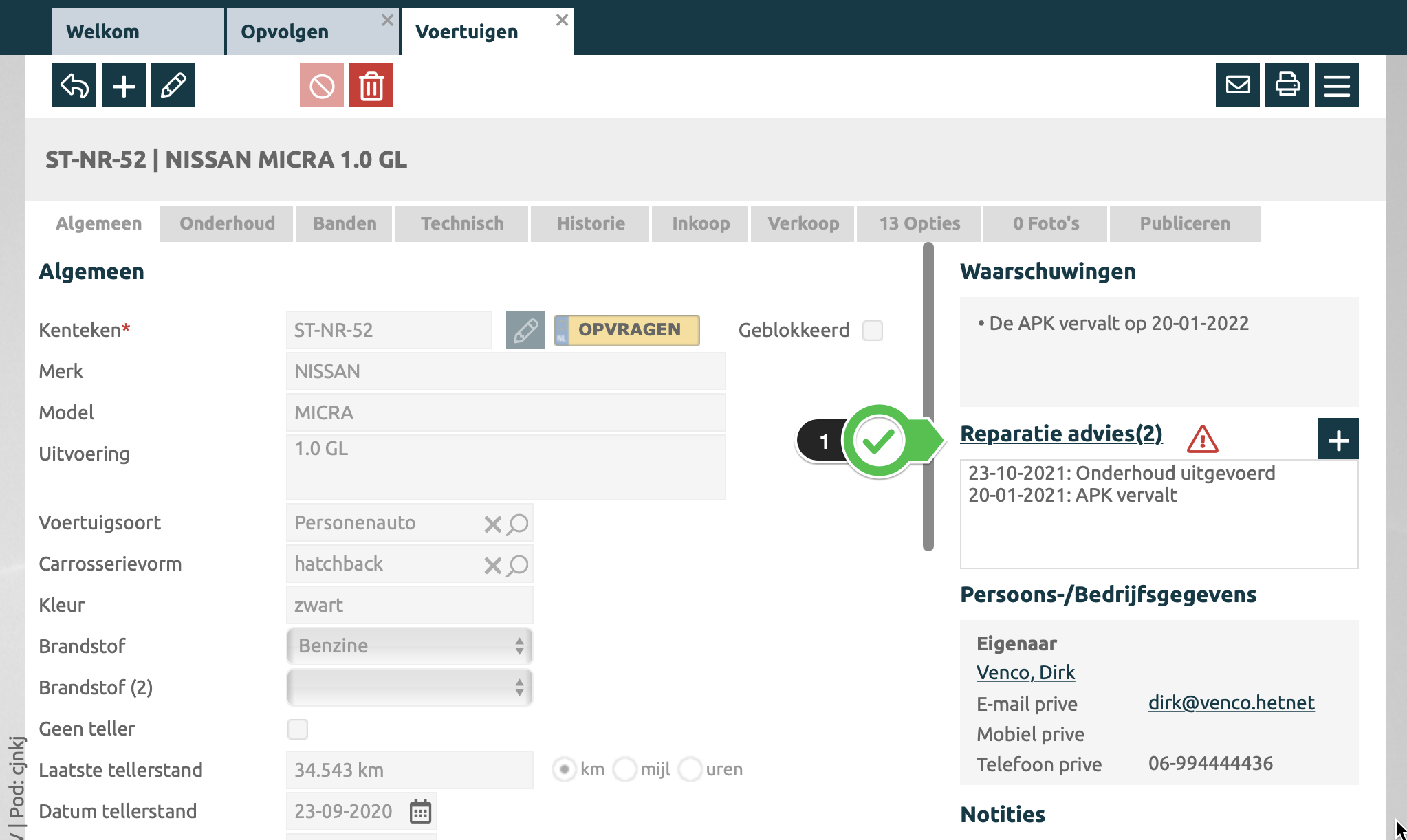 Reparatieadviezen is aangepast, het is nu mogelijk meer dan één advies per werkorder aan te maken. De reparatieadviezen zijn voorzien van een opvolgdatum. Via de CRM opvolging kunnen de adviezen worden opgevolgd. Reparatieadviezen zitten gekoppeld aan het kenteken. Bij het aanmaken van een nieuwe werkorder worden alle openstaande opvolg reparatieadviezen getoond.