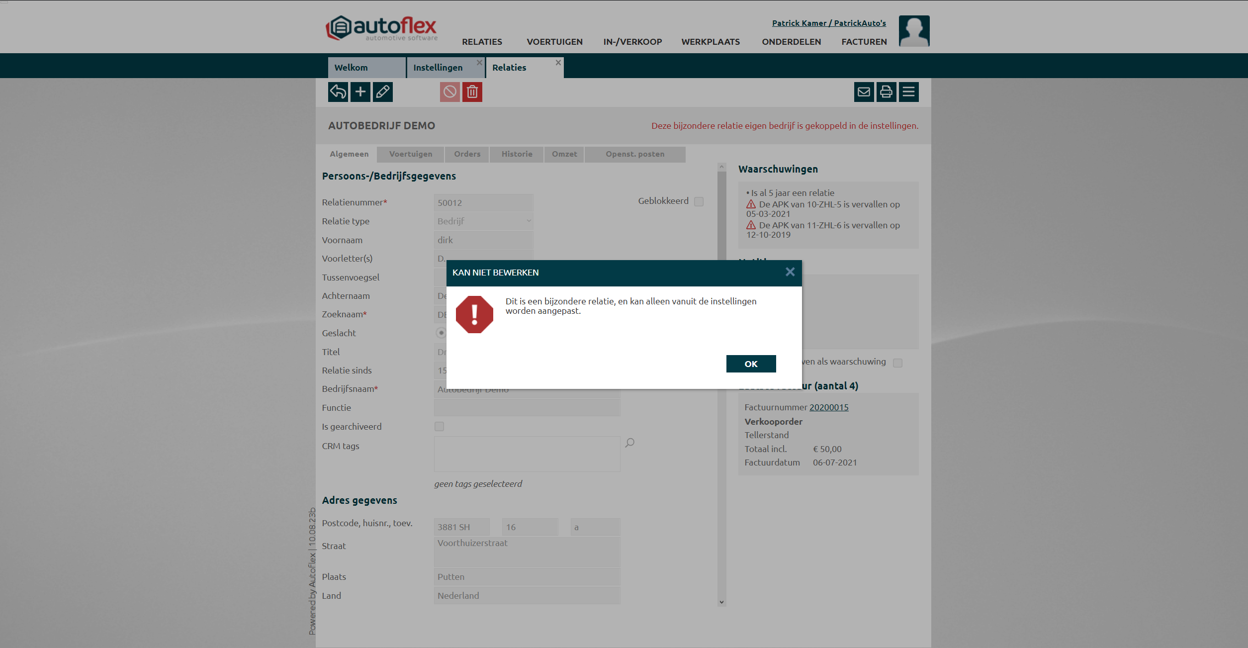 Hoe kan je de relatie eigen bedrijf bewerken? Dit is de relatie in Autoflex waar vandaan alle verkopen worden geboekt. Hieraan zijn dus ook de bedrijfsvoorraad auto’s gekoppeld. Deze relatie en ook gekoppeld aan je boekhouding. Je ziet, veel redenen waarom je niet zomaar deze relatie wilt wijzigen. Daarom hebben wij de speciale relaties, zoals deze, geblokkeerd voor wijzigen op de standaard wijze.