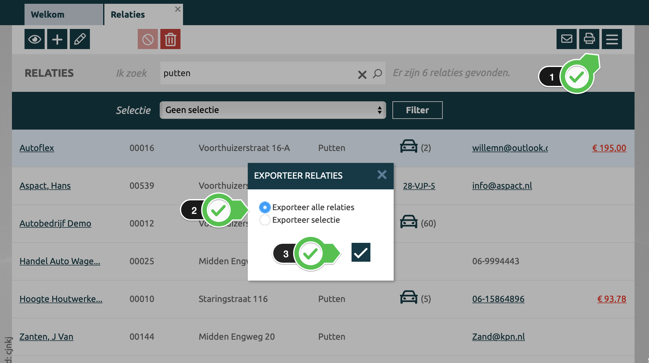 Via het hamburger menu → Exporteer relaties kun je de relaties exporteren vanuit Autoflex naar een Excel (XLS) bestand.