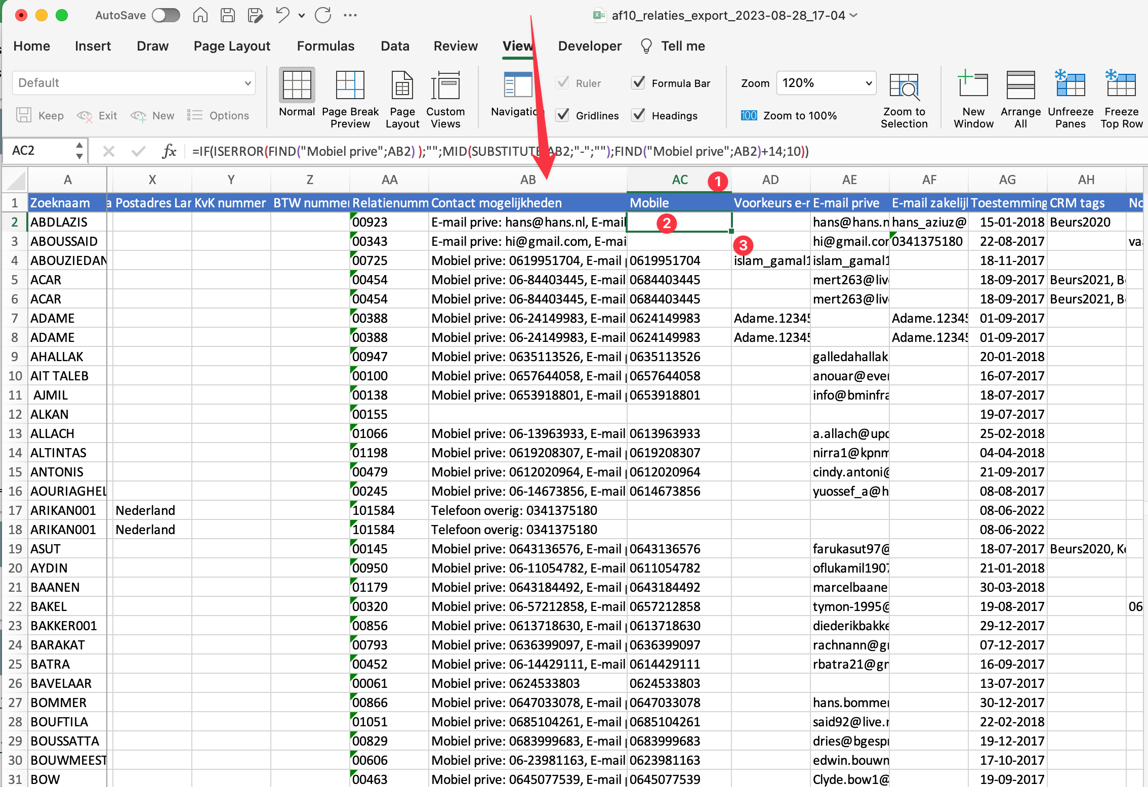 1. extra kolom toevoegt na de: Contact mogelijkheden, zoals in het screenshot, kolom AC