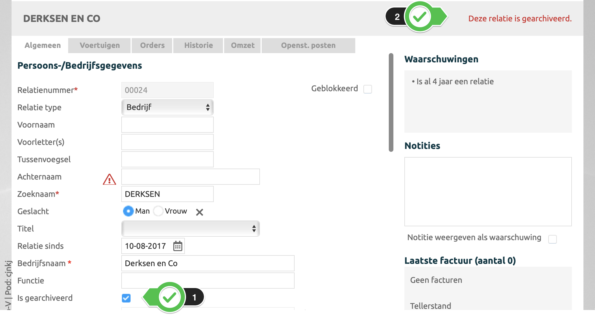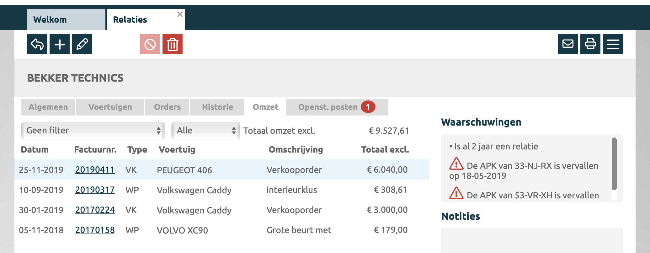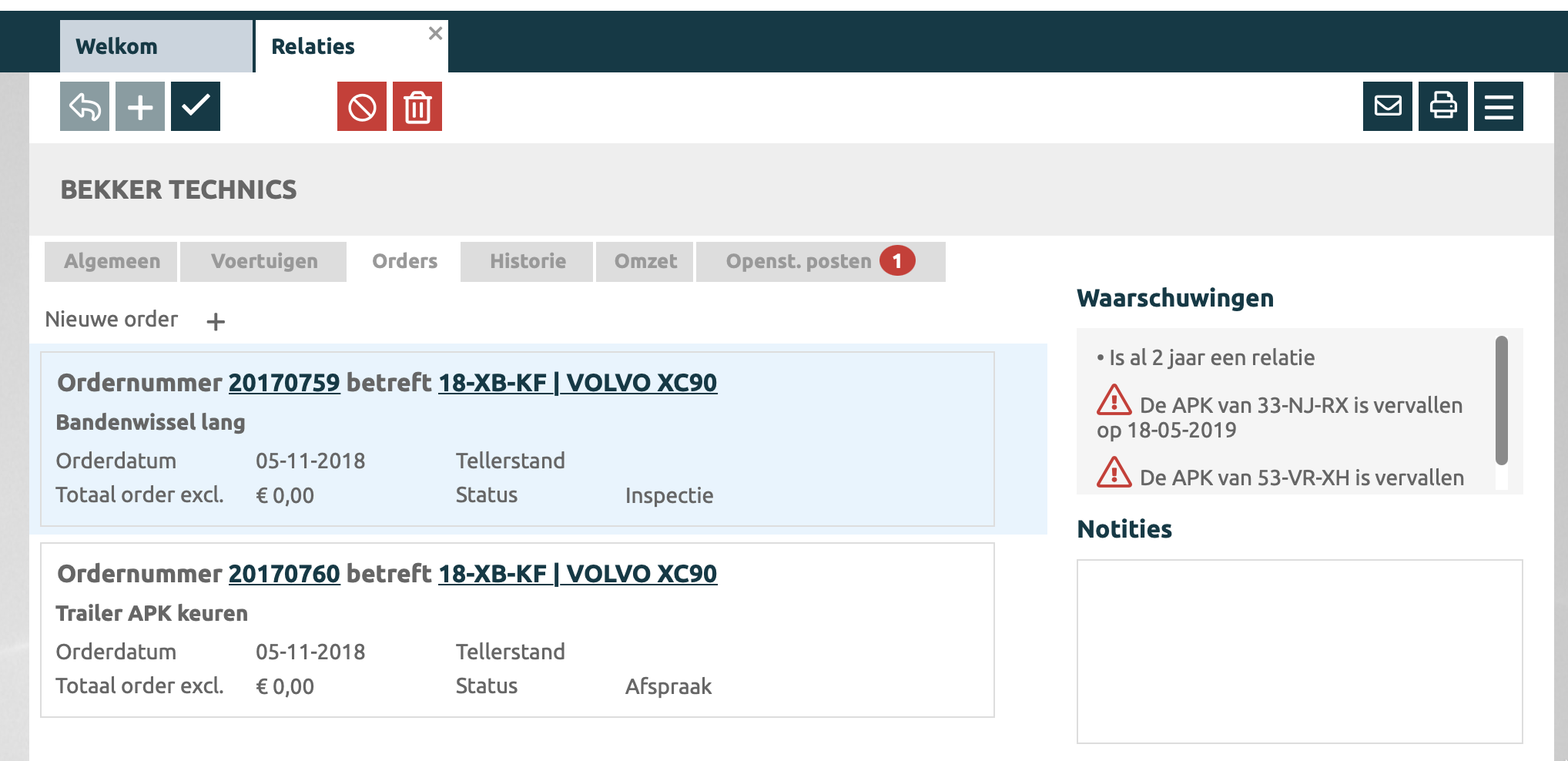 Hier worden de waarschuwingen over de klant, hoe lang is de klant al relatie en ook de waarschuwingen over de gekoppelde voertuigen getoondNotities