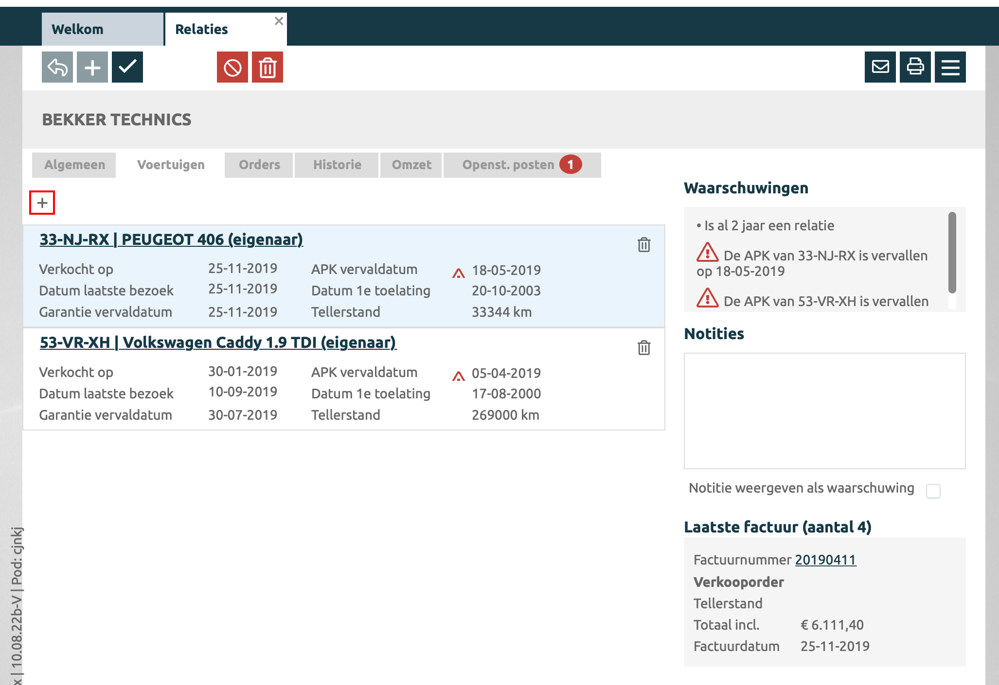 Met de '+' knop kan een nieuw voertuig worden aangemaakt of een bestaand voertuig worden gekoppeld aan deze relatie.