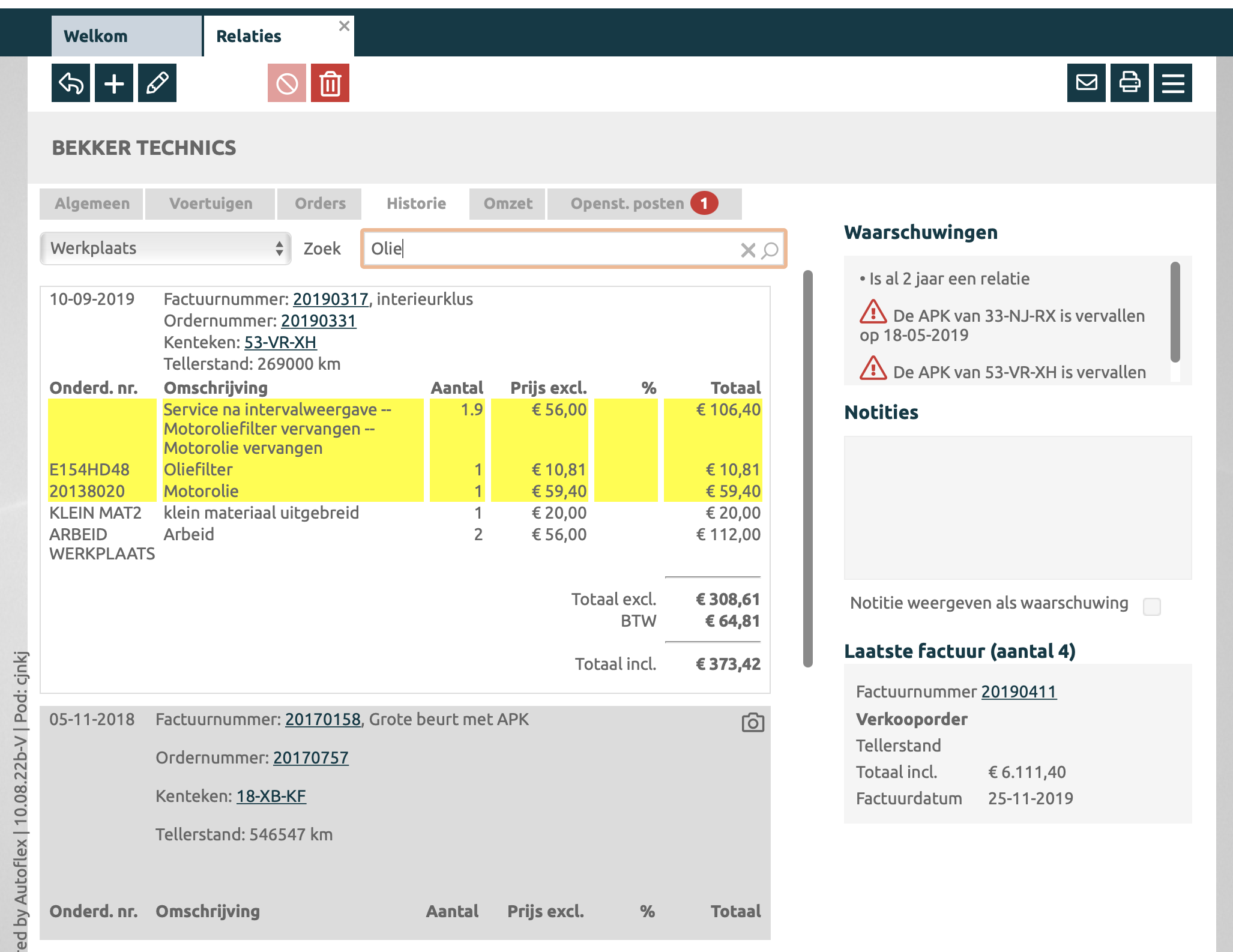 Overzicht van de openstaande posten op deze relatie. De openstaande posten worden via het gekoppelde boekhoudpakket ingelezen in Autoflex Zodra er één of meerdere openstaande posten zijn dan wordt dit duidelijk getoond met het rode nummer in het tabblad, zoals hierboven met de rode cijfer 1. |