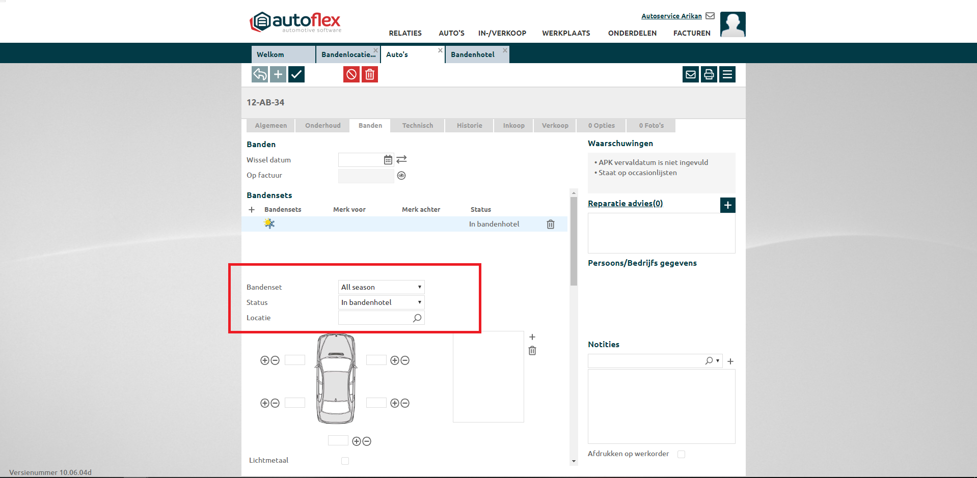 Bij 'status' kun je aangeven of de banden 'gemonteerd' zijn of in het 'bandenhotel' zijn.