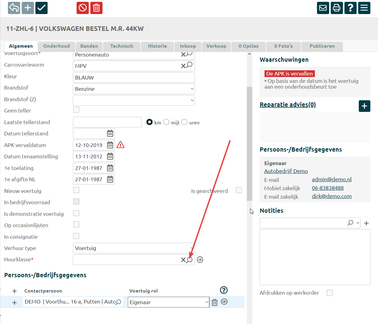 Selecteer nu een huurklasse door op het vergrootglas te klikken |