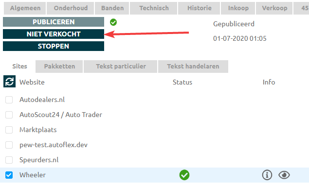 Met deze knop verwijder je de voertuig van alle websites. Ook de foto met het 'Verkocht' watermerk wordt verwijderd. Dit was een extra foto, de originele foto's blijven bewaard in Autoflex. |