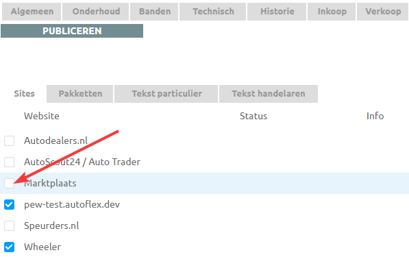 Geef met vinkjes aan op welke sites je de voertuig wil publiceren. In Instellingen --> Publiceren --> Tabblad Hexon websites bepaal je welke sites automatisch al aan staan. |
