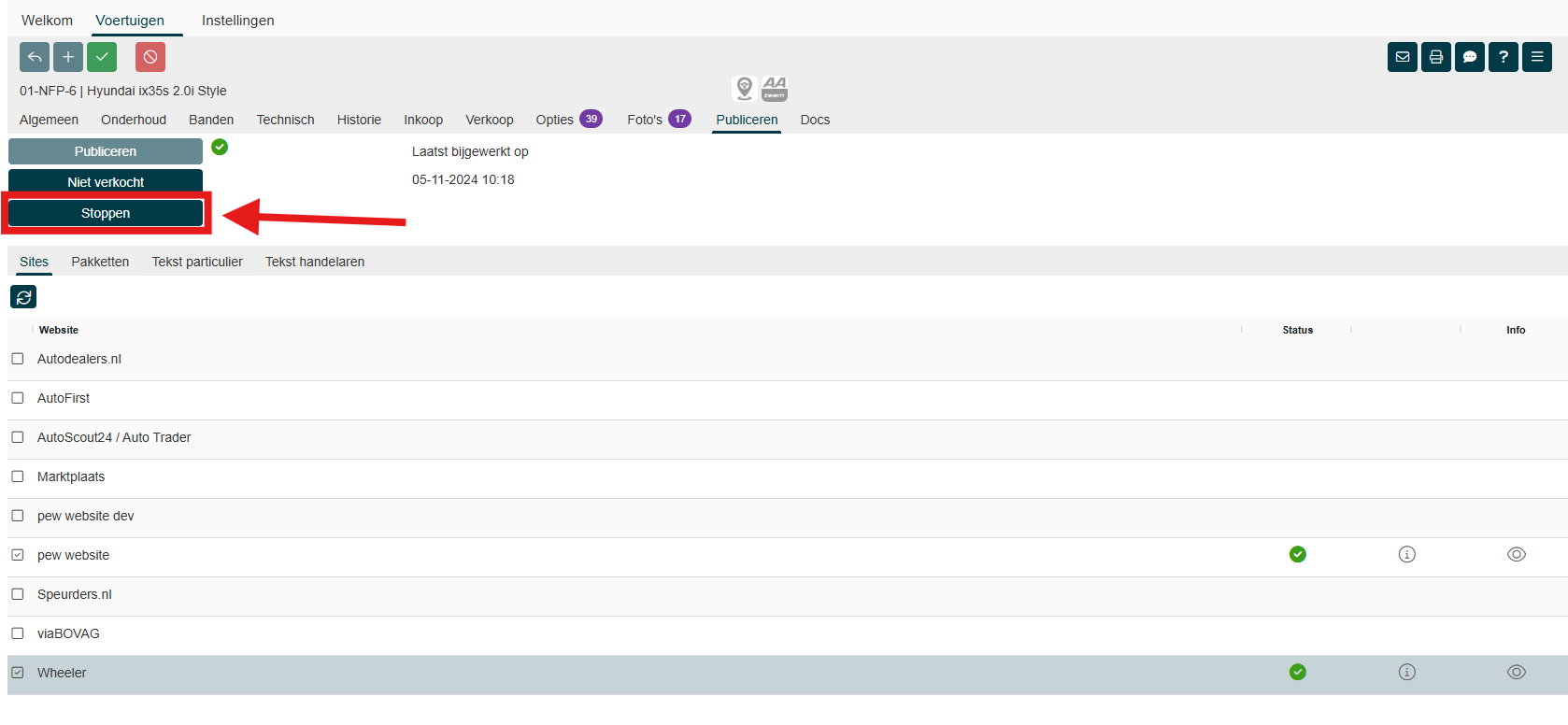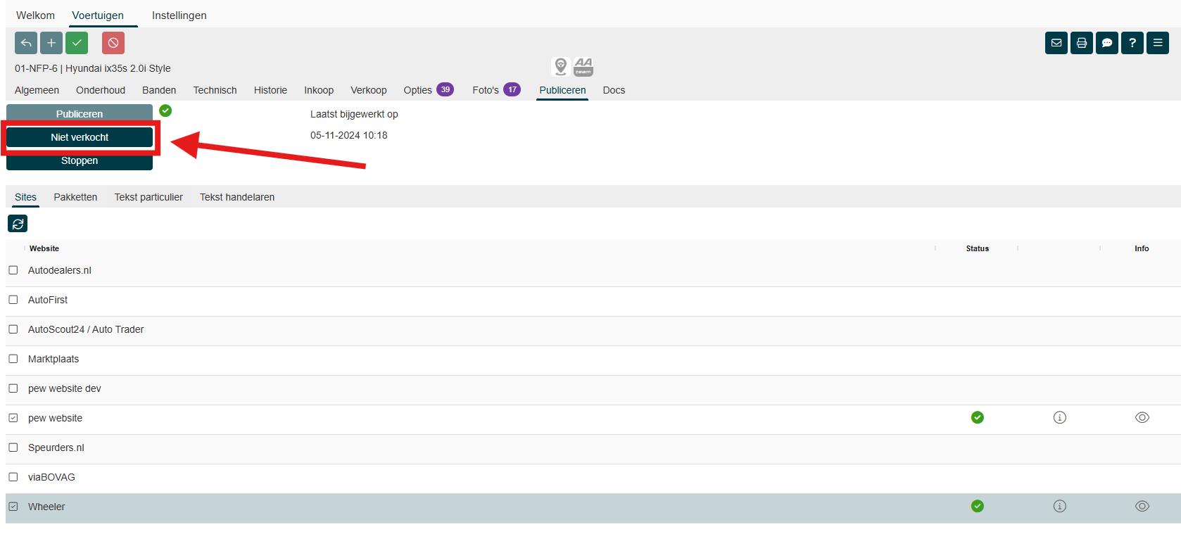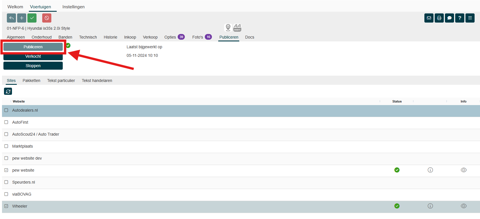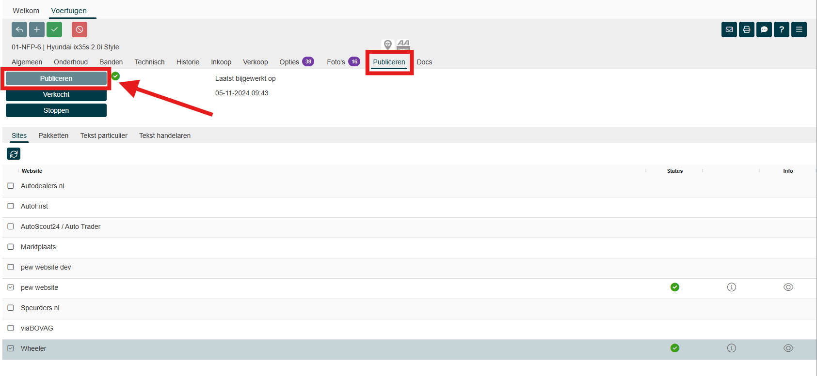 Een overzicht van alle gepubliceerde voertuigen met hun status vind je in het scherm In-/Verkoop --> Publiceren.