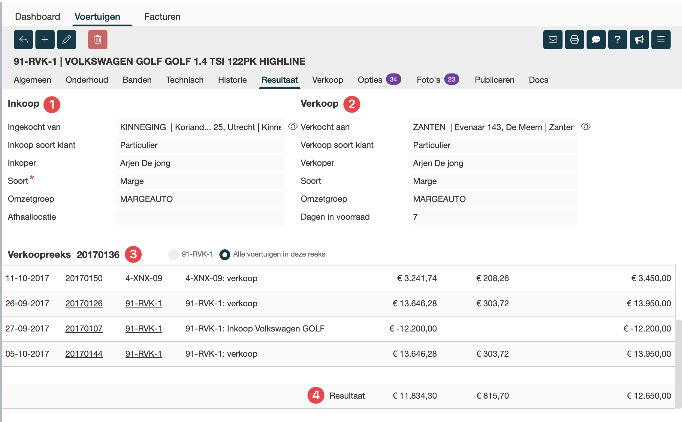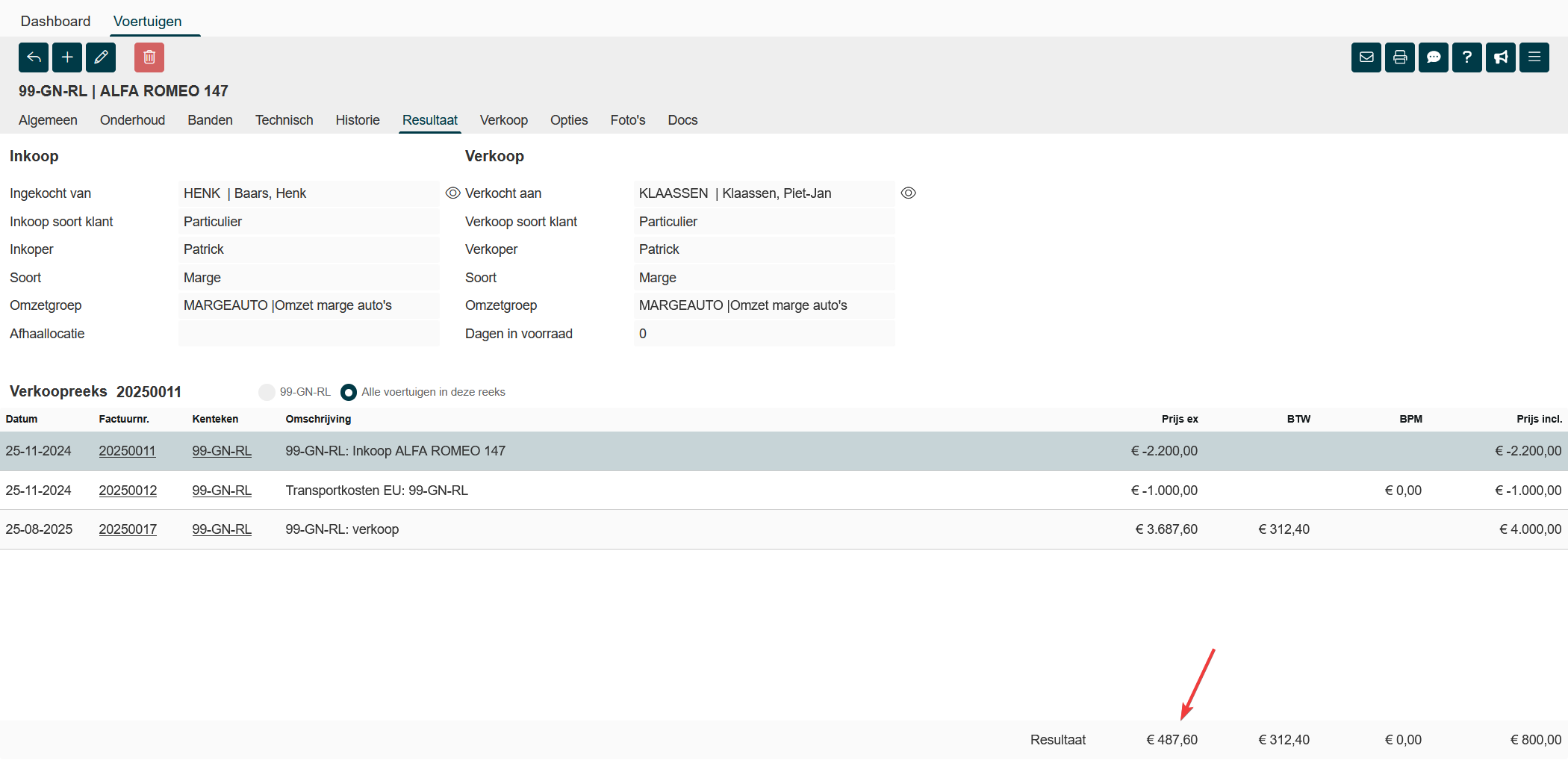 Deze tab toont het resultaat van de In-/Verkoop van het voertuig, dit noemen we de verkoopreeks.
