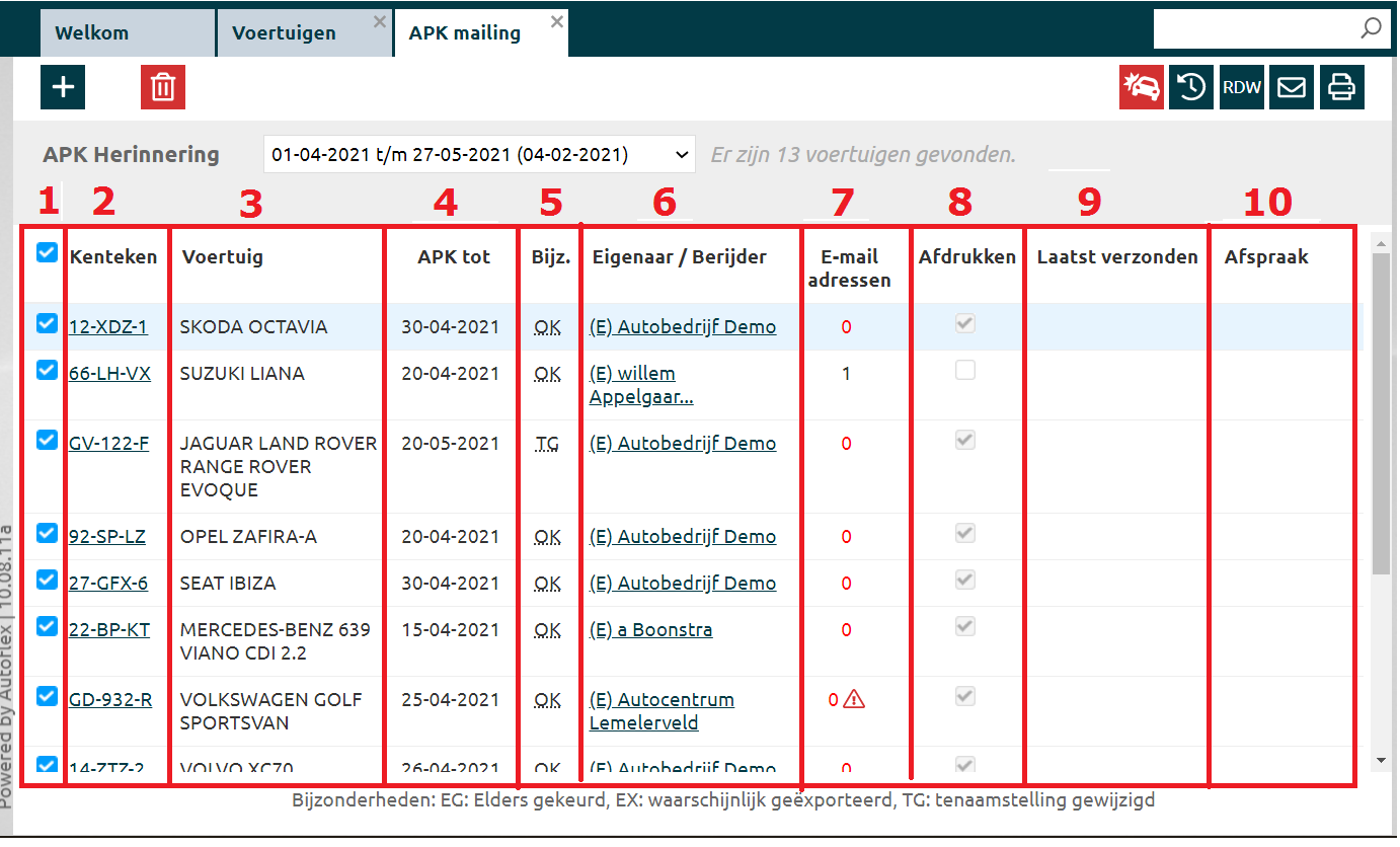 Klik de vinkjes aan voor de kentekens, welke klanten je een APK herinnering wilt versturen.