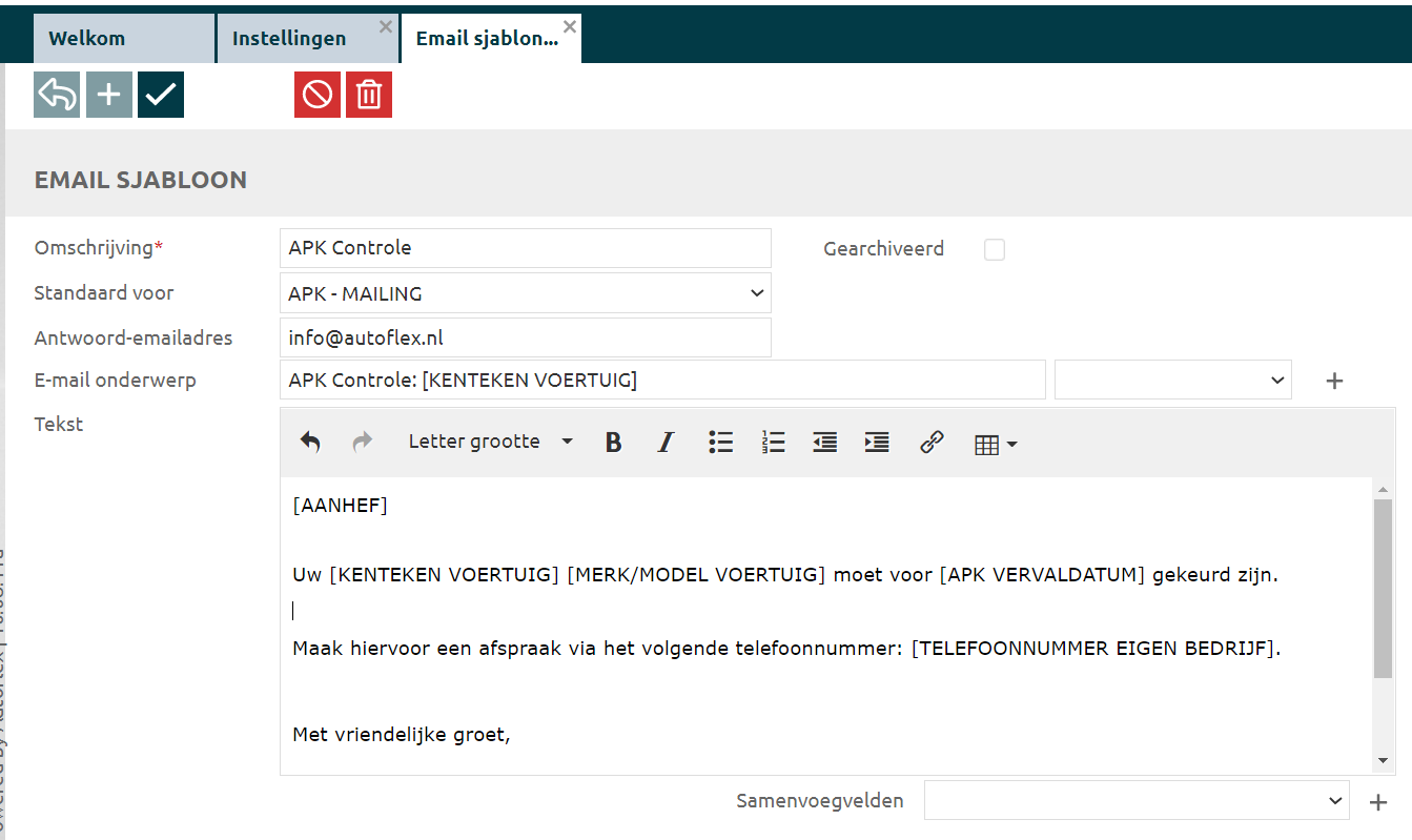 Om de tekst van de APK brief aan te passen, ga naar Instellingen → tabblad Lay-outs → tabblad Standaard en kies bij soort voor: APK herinnering. |