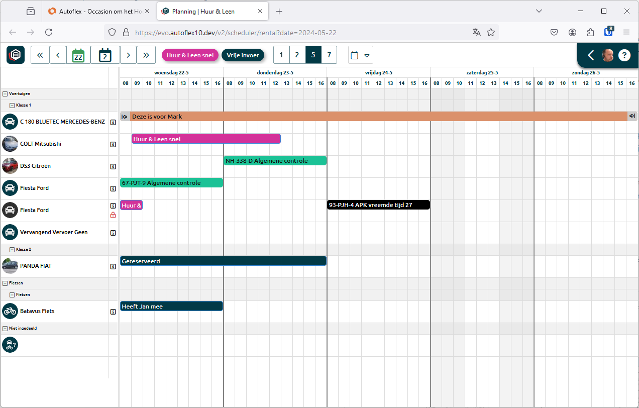 Je kunt voor elke leenfiets een 'voertuig' aanmaken. Kies hierbij als kenteken bijvoorbeeld FIETS01' en bij verhuurtype geef je aan dat het een fiets is. De fiets wordt nu op de juiste manier getoond in het overzicht.