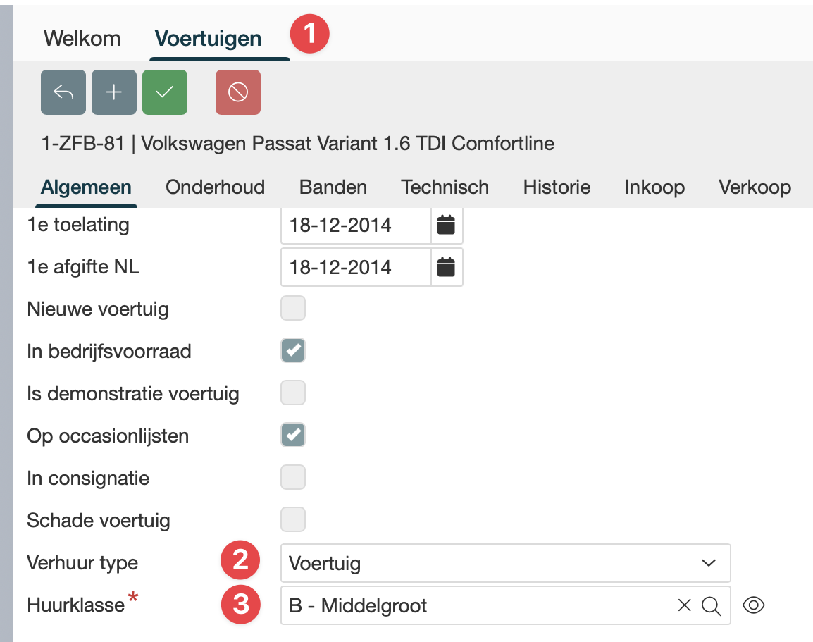 Om ervoor te zorgen dat de huur- en leenvoertuigen in de planning getoond worden, moet je een “verhuur type” toevoegen aan het voertuig. Dit doe je door middel van het veld 'Verhuur type' op het tabblad algemeen te selecteren (zie afbeelding 2). Het is ook mogelijk om leenfietsen te registreren. Voertuigen en fietsen worden per groep in de planning weergegeven.