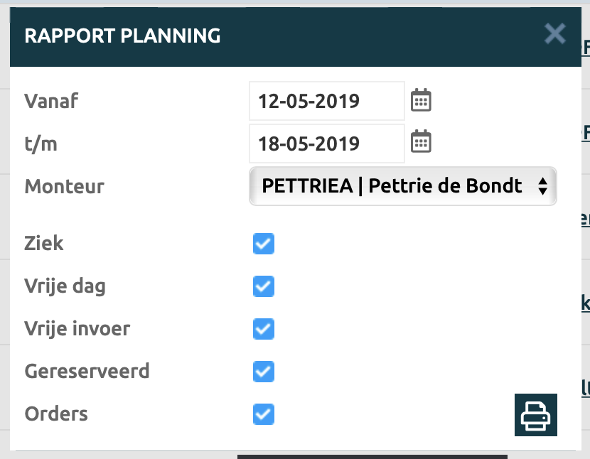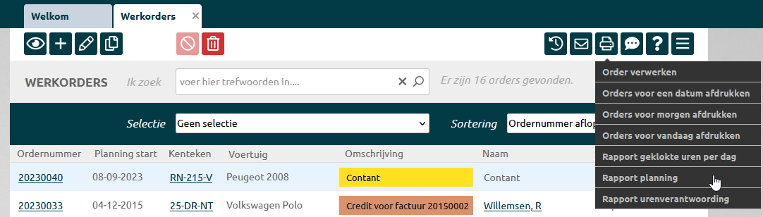 Werkplaats → Werkorders → printer icoon rechts boven in → Rapport Planning
