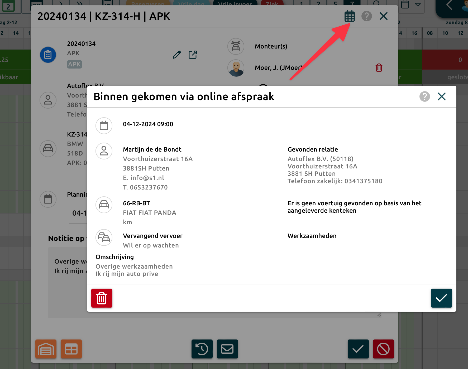 De originele gegevens van de afspraak zijn via het kalender icoon terug te zien bij de werkorder die aangemaakt is vanuit een Online afspraak |