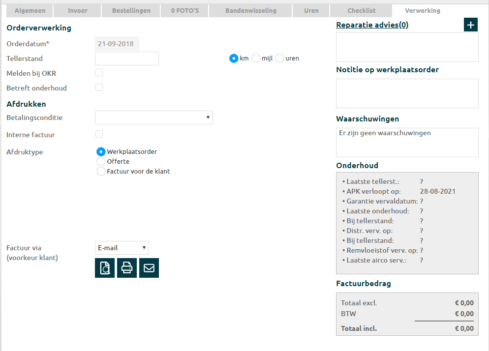 Een aangemaakte werkorder kun je als een werkplaatsorder afdrukken, offerte mailen/printen en/of een factuur mailen/printen.