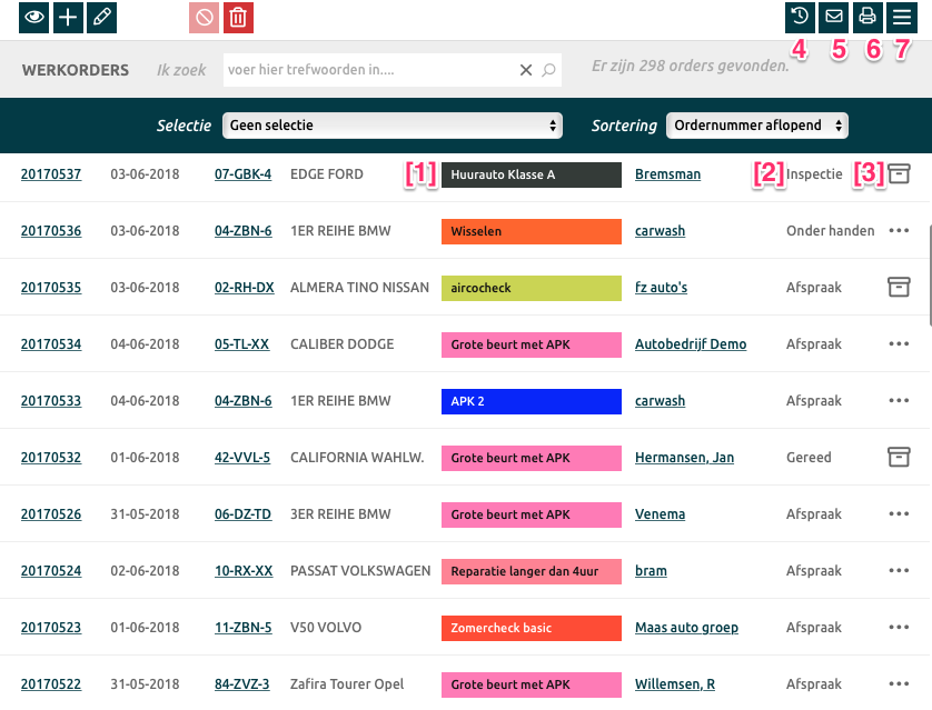 Het is mogelijk om een selectie maken op: openstaande orders, deze week in werkplaats, interne orders etc. Je kunt ook de sortering aanpassen (o.a. kenteken aflopend, orderdatum oplopend).