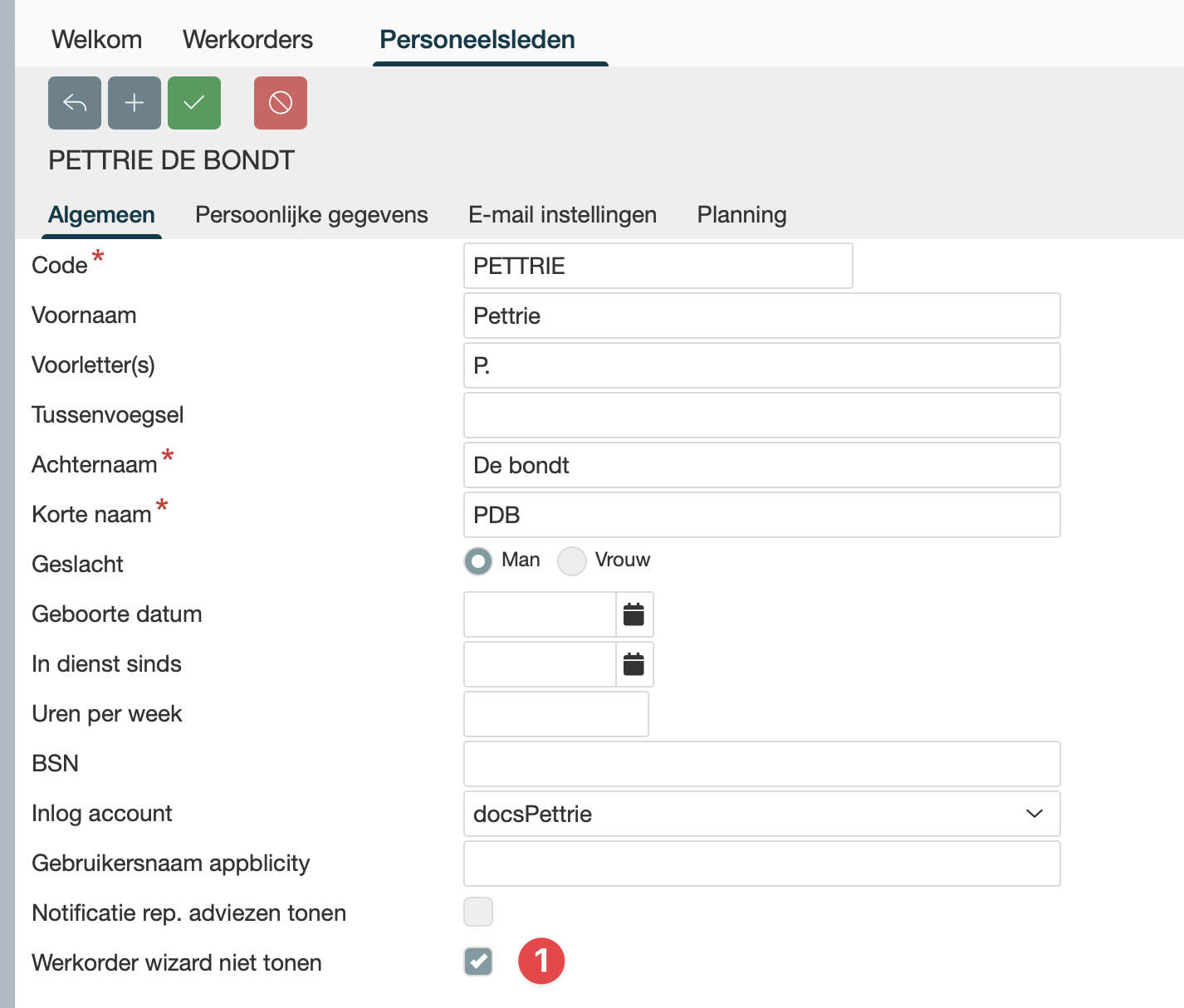 In het personeelsprofiel onder Algemeen kan de wizard aan of uit gezet worden met de optie 'Werkorder wizard niet tonen'. Per personeelslid stel je in of deze persoon wel of niet met de Wizard wil werken. |