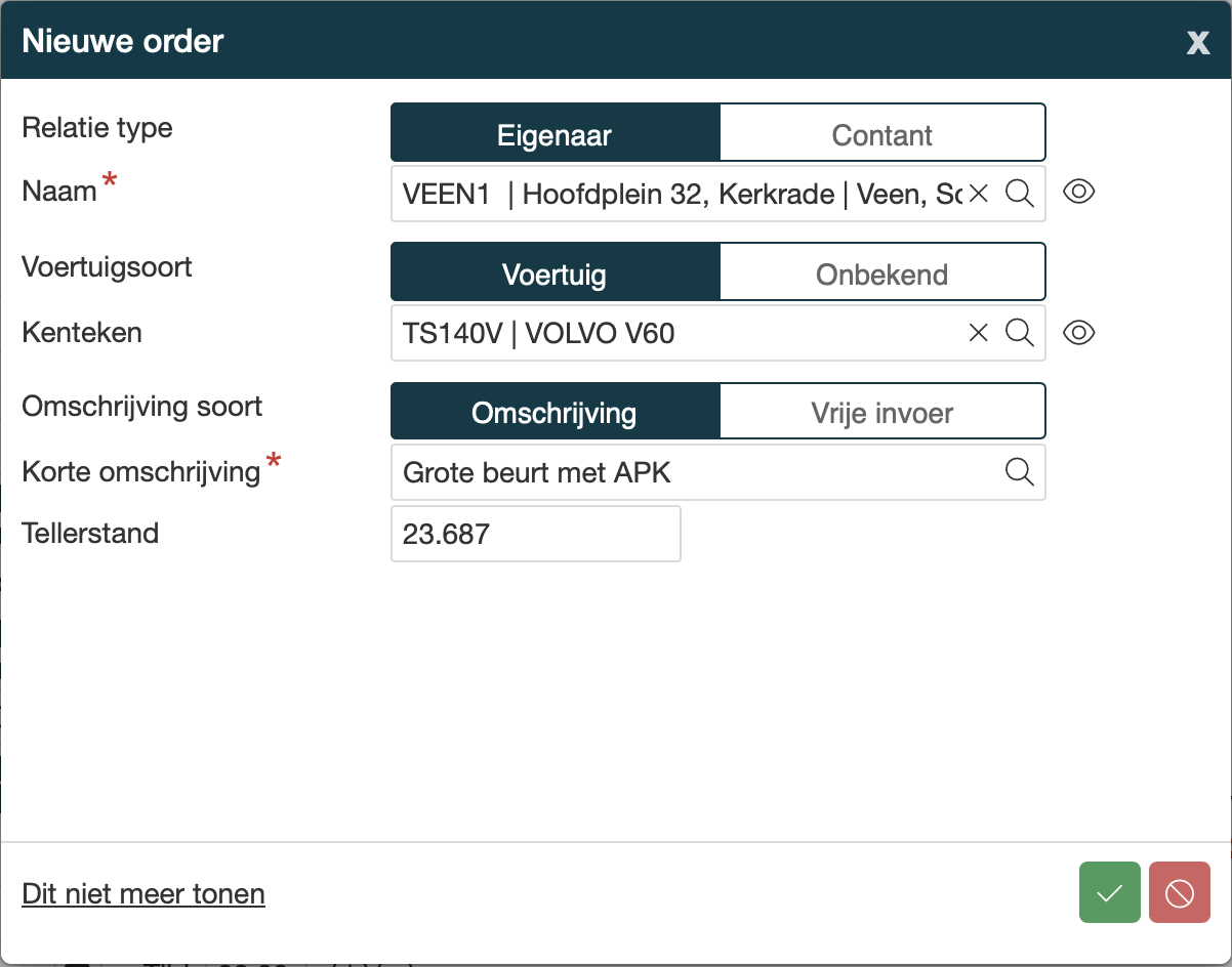 De eerste optie 'Order' geeft de 4 belangrijkste velden voor een order. Na het invullen kun je verder met de werkorder zoals je gewent bent. |