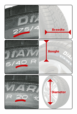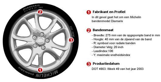 Hieronder een verkorte lijst met de meest gebruikte kenmerken, ref: https://www.banden-pneus-online.nl/lees-de-markering-van-banden-advies.html