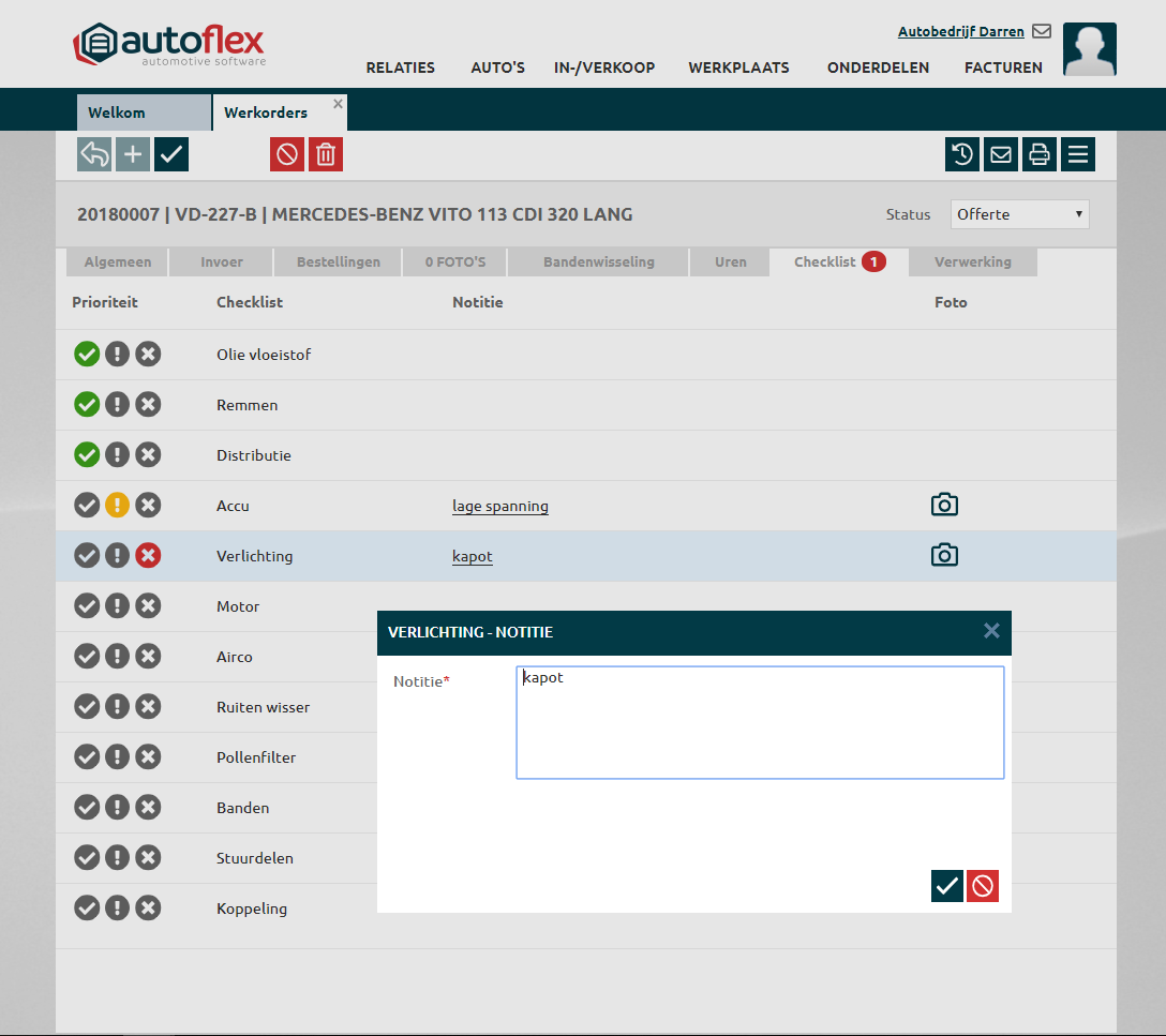 Als er een oranje checklist item is aangevinkt en de order is verwerkt naar factuur, dan wordt er van dit item een reparatie-advies aangemaakt. Dit betekend dat bij dit voortuig een advies is aangemaakt die altijd weer duidelijk terug te vinden is. Op deze manier kun je duidelijk en overzichtelijk bijhouden wat de volgende actie punten zjin bij dit voertuig. Via opvolgen kun je deze reparatie-adviezen in de tijd bijhouden en tijdig de klant informeren voor reparaties.