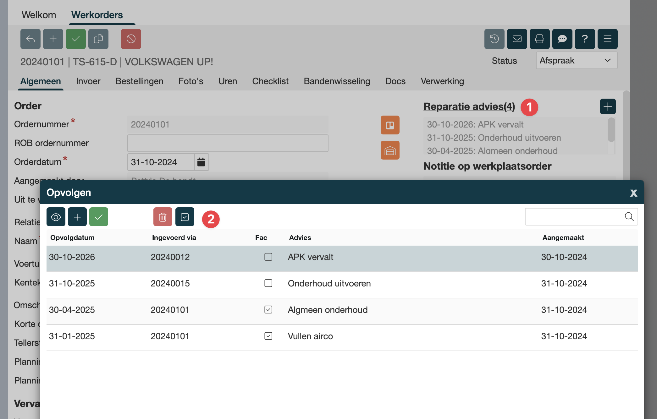 Advies punten zichtbaar in de werkorder, bij dit voertuig |