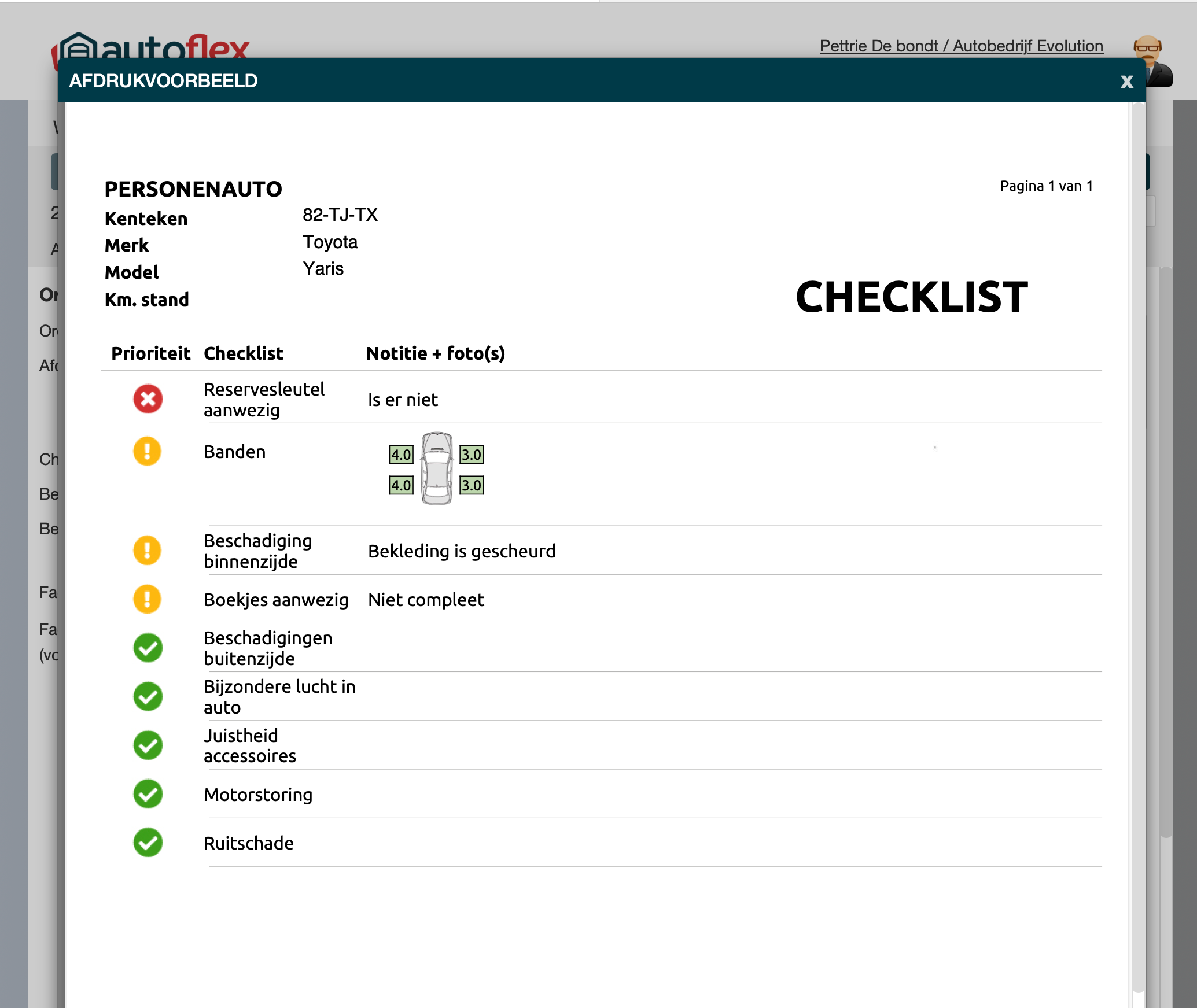Je kunt de checklist voor intern gebruik gebruiken om te controleren of alle onderdelen van het voertuig zijn gecontroleerd. Je kan de checklist ook zeker gebruiken om mee te geven aan de klant, om zo te laten zien wat er allemaal gecontroleerd is en wat eventueel aandacht nodig heeft in de toekomst (oranje) of zaken die direct aangepakt moeten worden (rood).