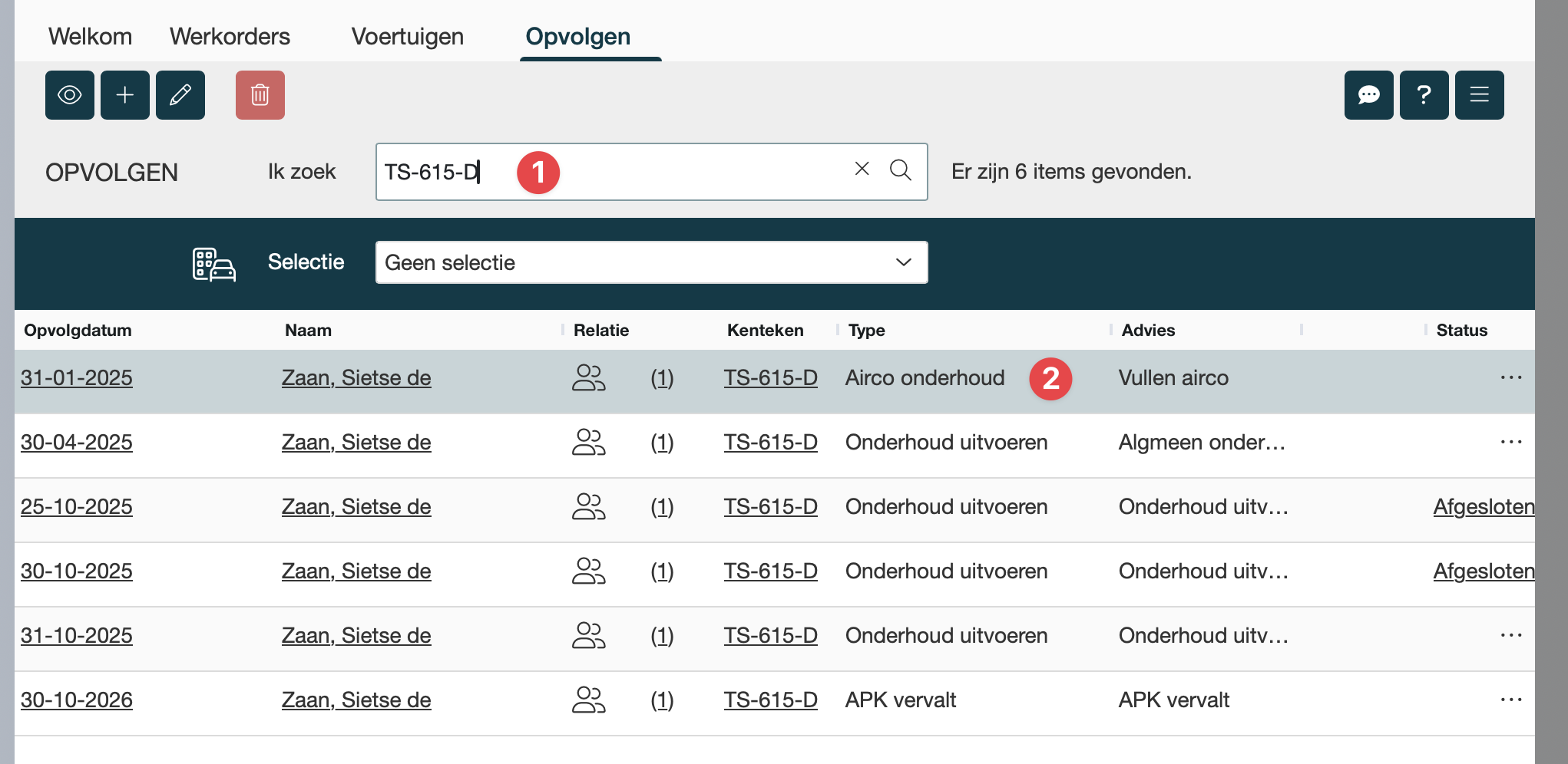Advies punten zichtbaar in de werkorder, bij dit voertuig |