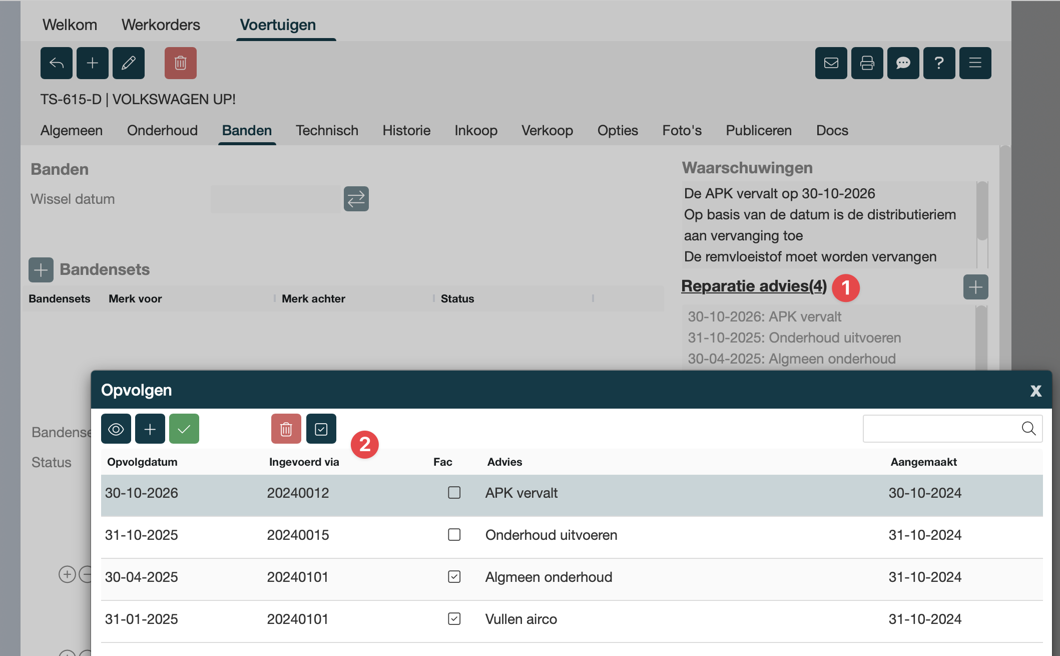Als er een oranje checklist item is aangevinkt en de order is verwerkt naar factuur, dan wordt er van dit item een reparatie-advies aangemaakt. Dit betekend dat bij dit voortuig een advies is aangemaakt die altijd weer duidelijk terug te vinden is. Op deze manier kun je duidelijk en overzichtelijk bijhouden wat de volgende actie punten zjin bij dit voertuig. Via opvolgen kun je deze reparatie-adviezen in de tijd bijhouden en tijdig de klant informeren voor reparaties.
